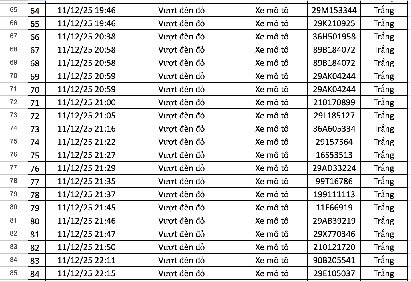 Danh sách cụ thể 78 trường hợp xe máy vi phạm như sau: