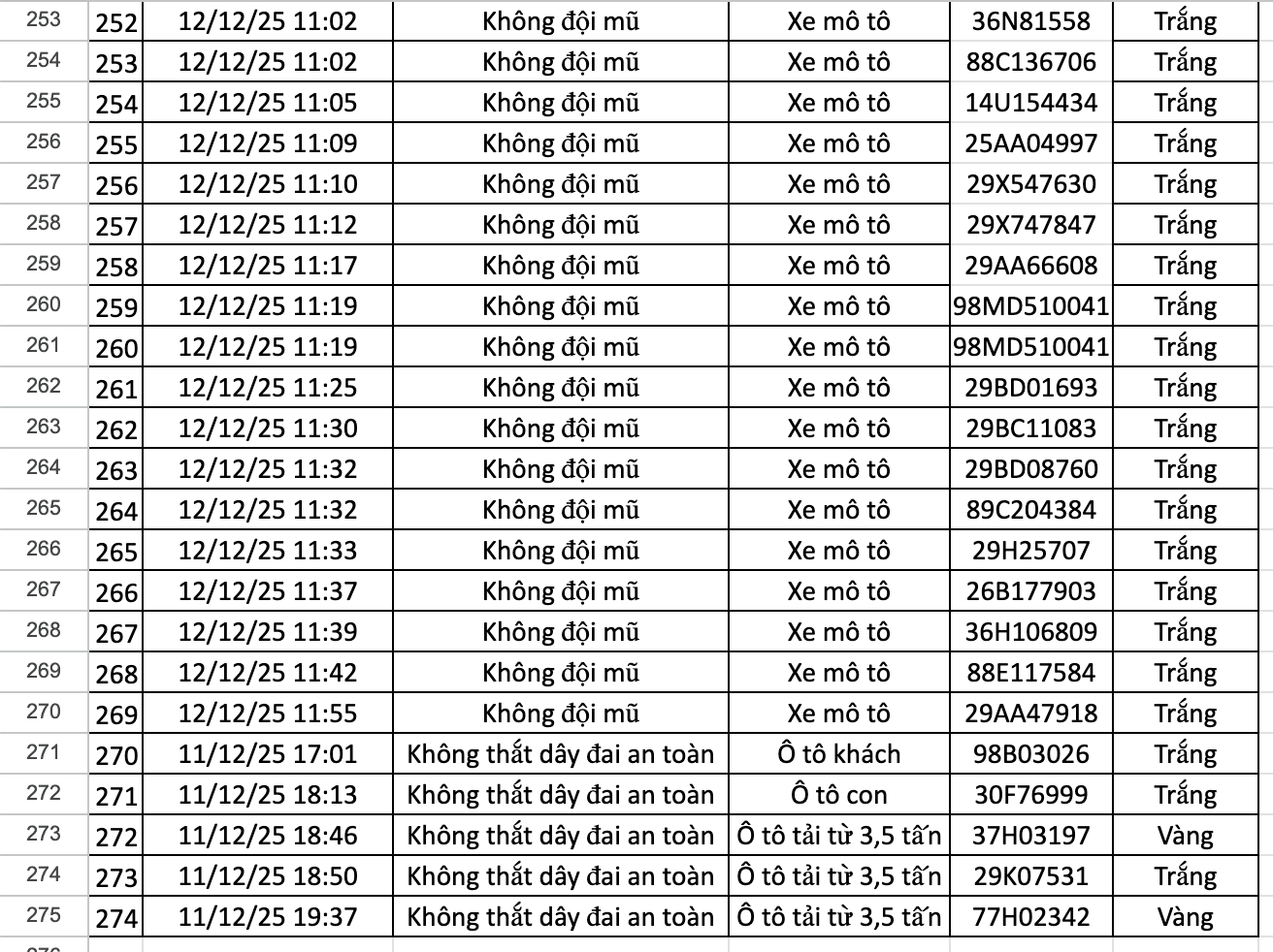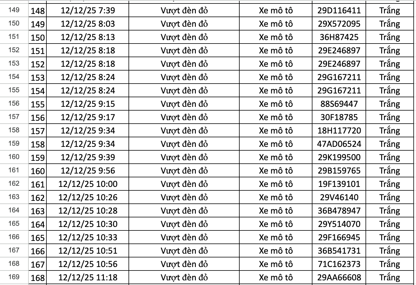 Danh sách 148 trường hợp xe máy vi phạm như sau:
