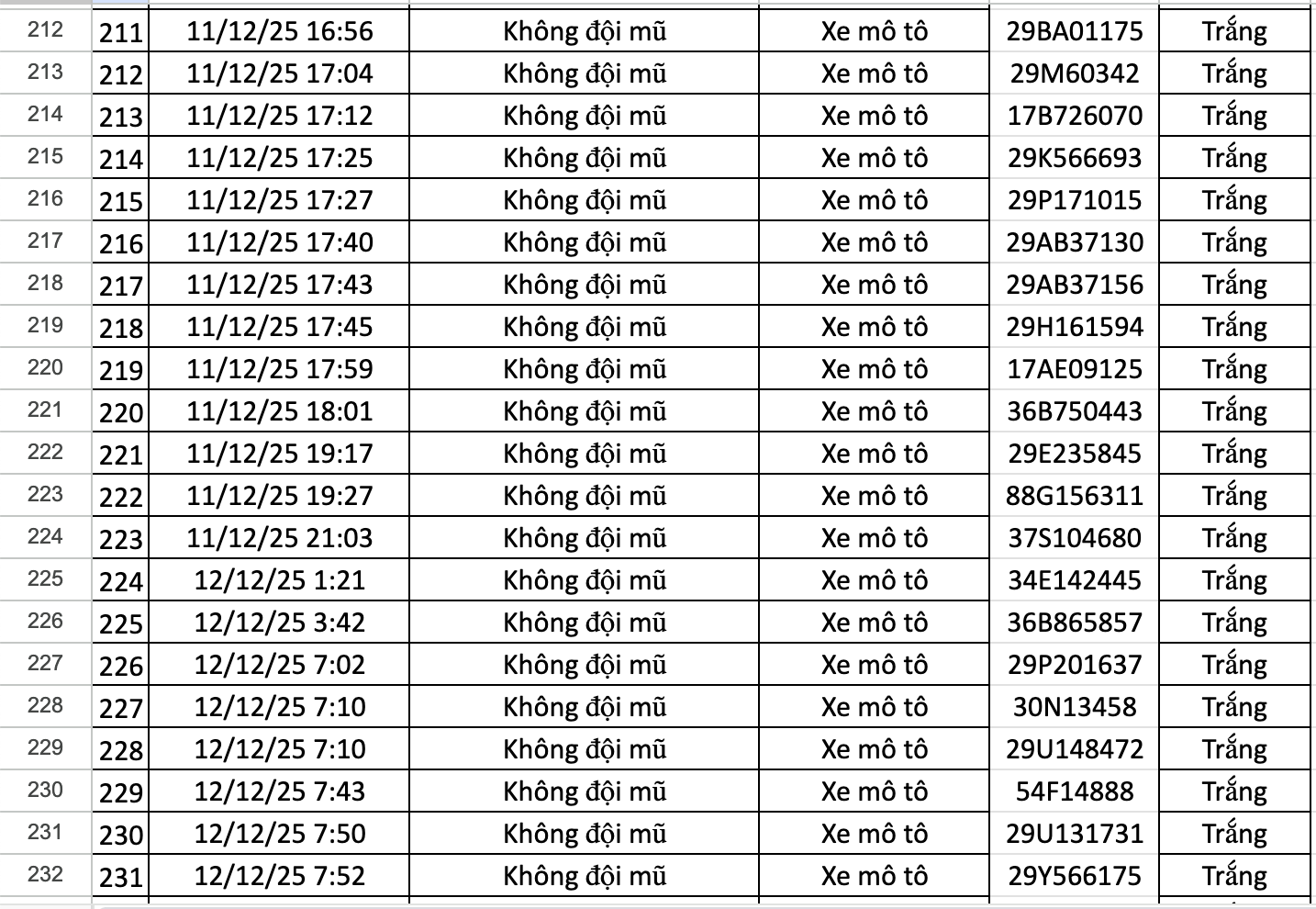 Danh sách 176 trường hợp xe máy vi phạm như sau:
