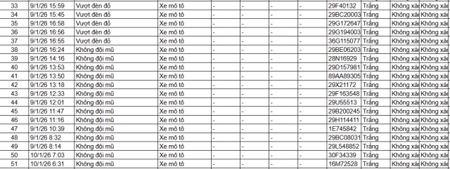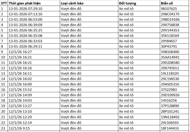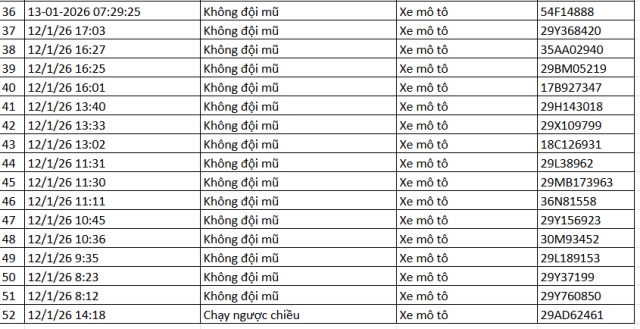 Song song với đó, dữ liệu do Cục Cảnh sát giao thông trích xuất từ hệ thống camera AI giao thông thí điểm tại khu vực nội đô Hà Nội, đặc biệt tại nút giao Phạm Văn Bạch – Hoàng Quán Chi, cho thấy số lượng xe máy vi phạm vẫn ở mức cao trong nhiều khung giờ khác nhau. Cụ thể, trong khoảng thời gian từ 12h ngày 12-1-2026 đến 12h ngày 13-1-2026, hệ thống tự động ghi nhận 52 trường hợp xe máy vi phạm.