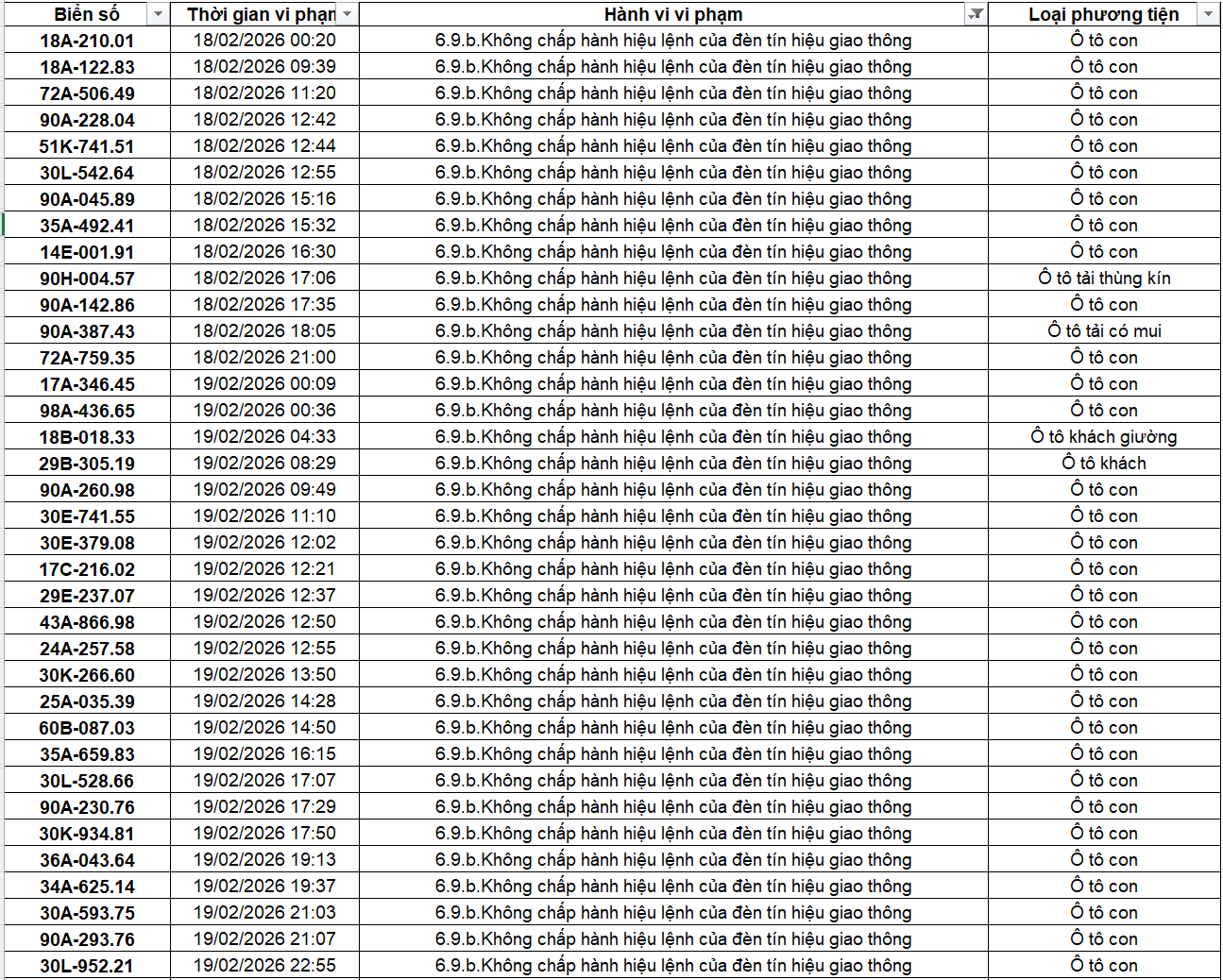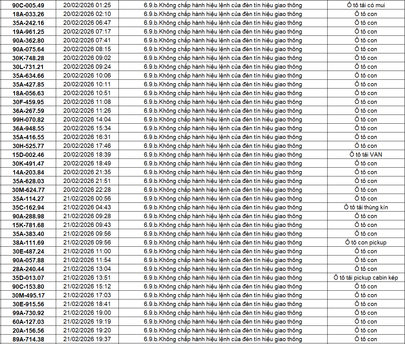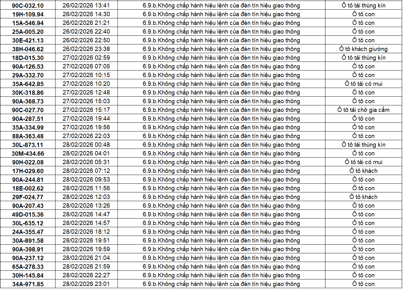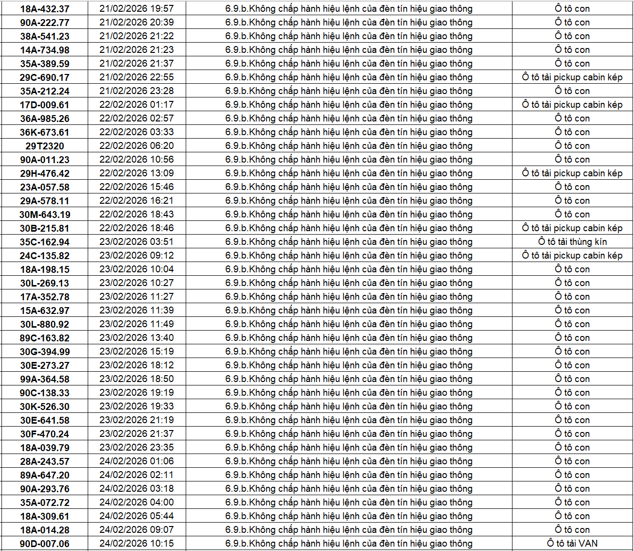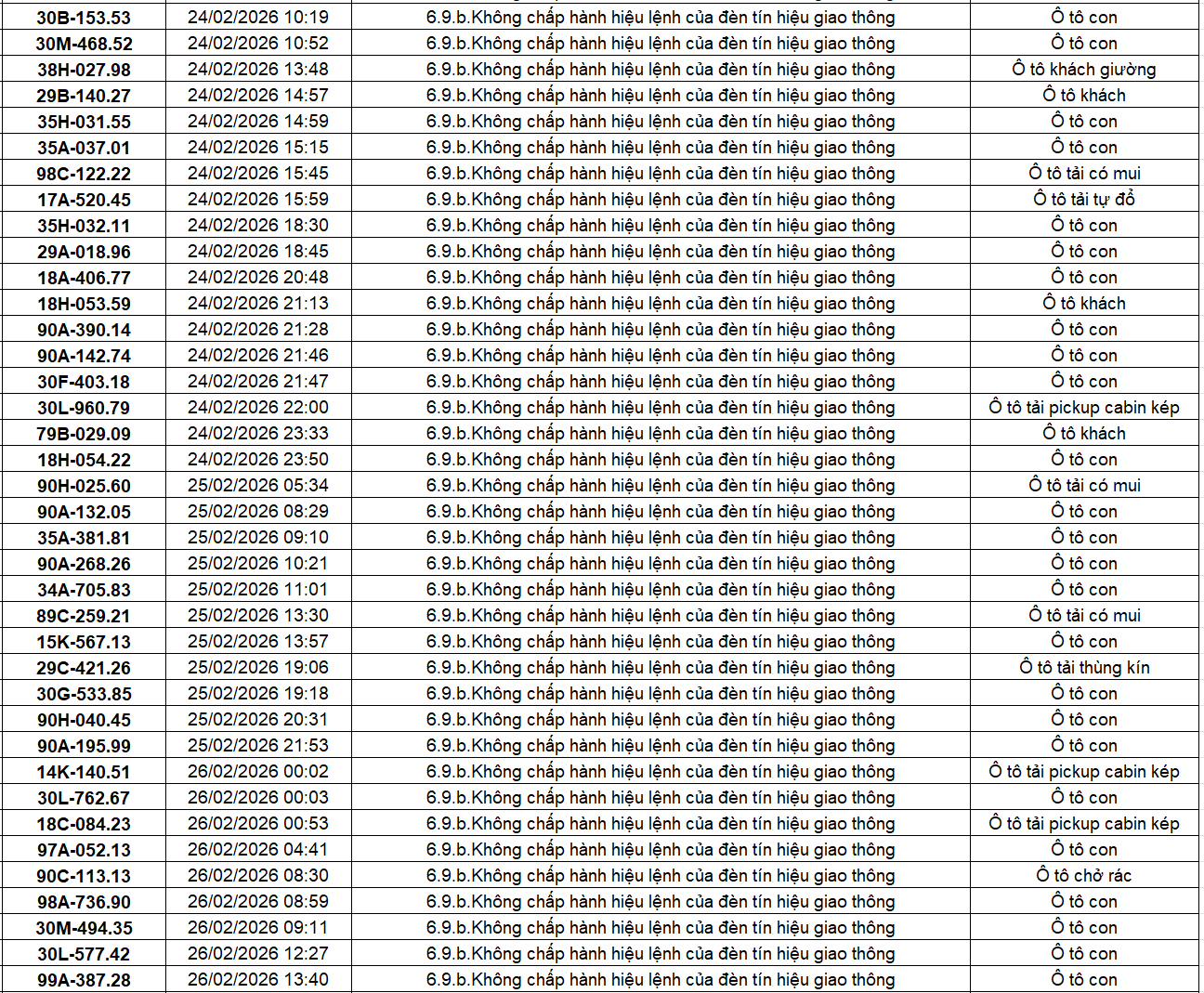 Công an các tỉnh thành đã xác định thêm nhiều trường hợp vi phạm lỗi vượt đèn đỏ qua hệ thống giám sát giao thông trong thời gian từ giữa đến cuối tháng 2/2026. Ngày 10 tháng 3 năm 2026, báo Đời Sống Pháp Luật đăng tải bài viết với tiêu đề: 404 chủ xe có biển số sau nhanh chóng nộp phạt nguội theo Nghị định 168: Vi phạm cùng 1 lỗi có mức phạt lên tới 20 triệu đồng, Có nội dung như sau: