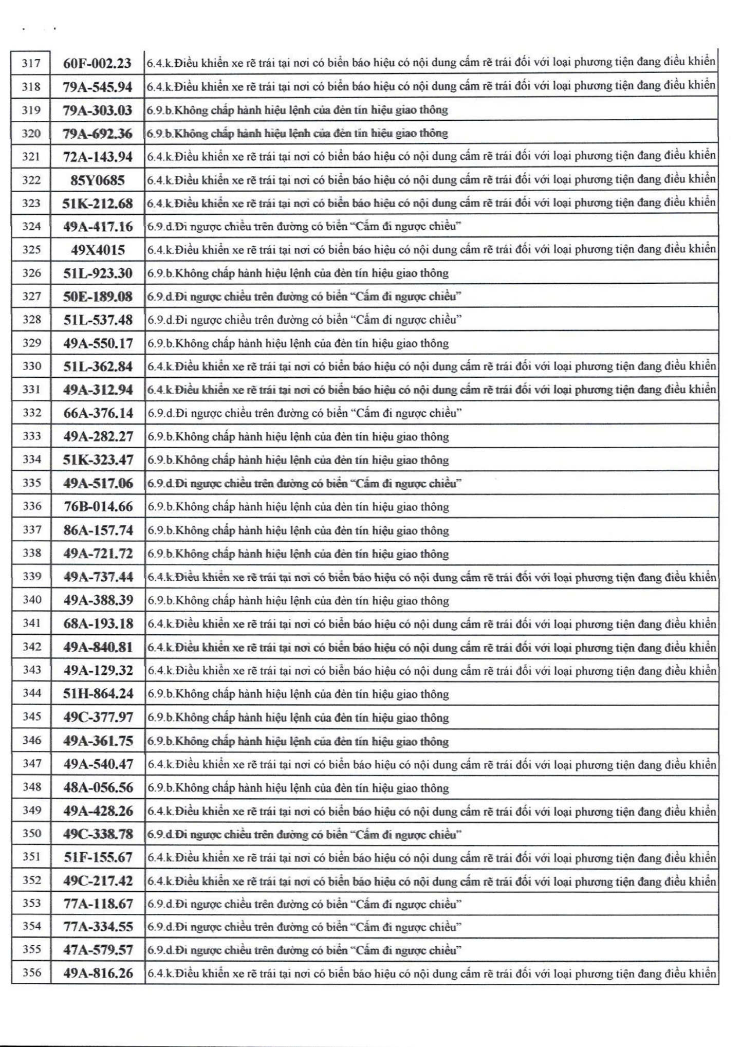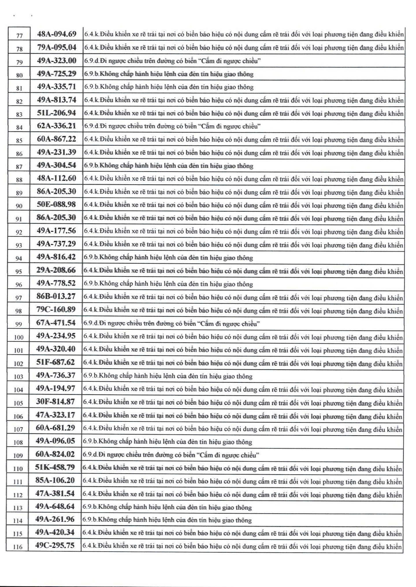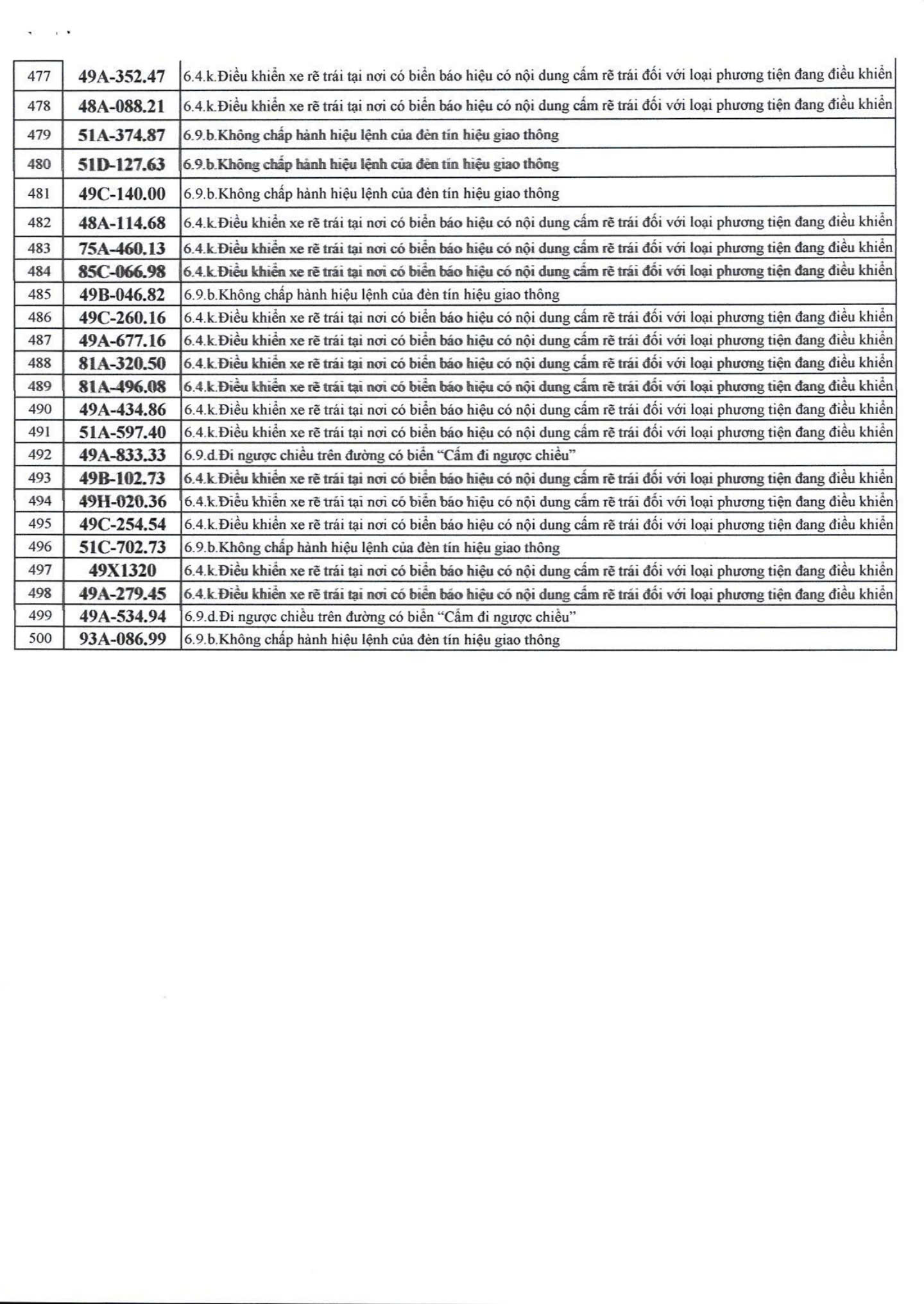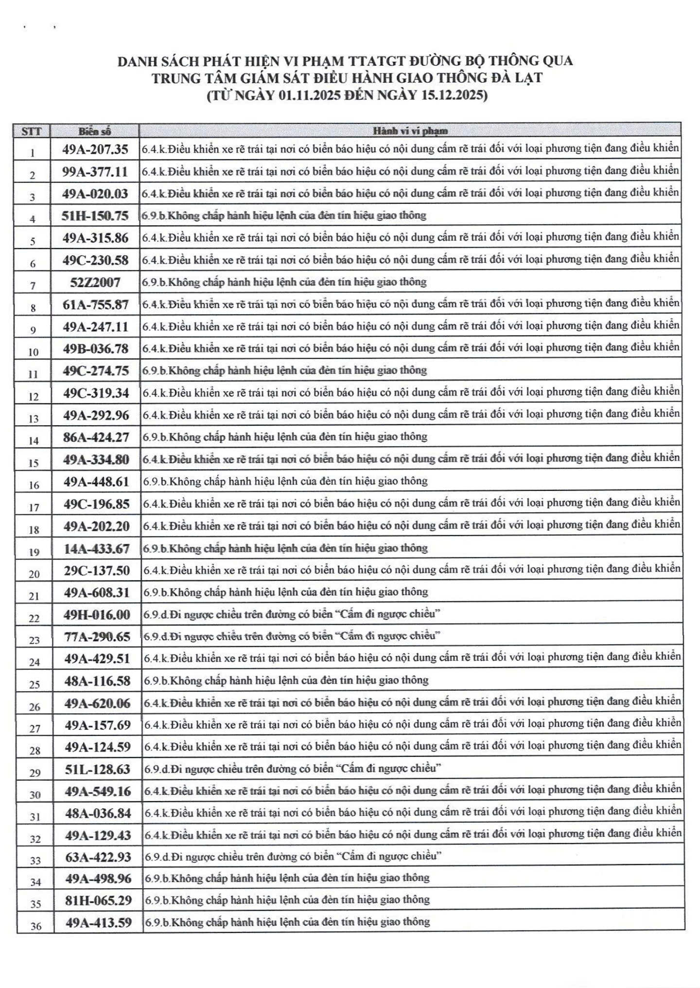 Ngày 24/12, Phòng Cảnh sát Giao thông - Công an tỉnh Lâm Đồng đã thông báo kết quả ghi nhận phương tiện vi phạm giao thông đường bộ từ ngày 01/11/2025 đến ngày 15/12/2025. Theo đó, có 500 trường hợp vi phạm phạt nguội trong thời gian này với các lỗi thường gặp là đi ngược chiều, không chấp hành hiệu lệnh của đèn tín hiệu giao thông... Trong thời hạn 30 ngày (kể từ ngày vi phạm), yêu cầu chủ phương tiện, tổ chức, cá nhân có liên quan đến vi phạm hành chính liên hệ để nộp phạt.Danh sách phạt nguội cụ thể như sau:
