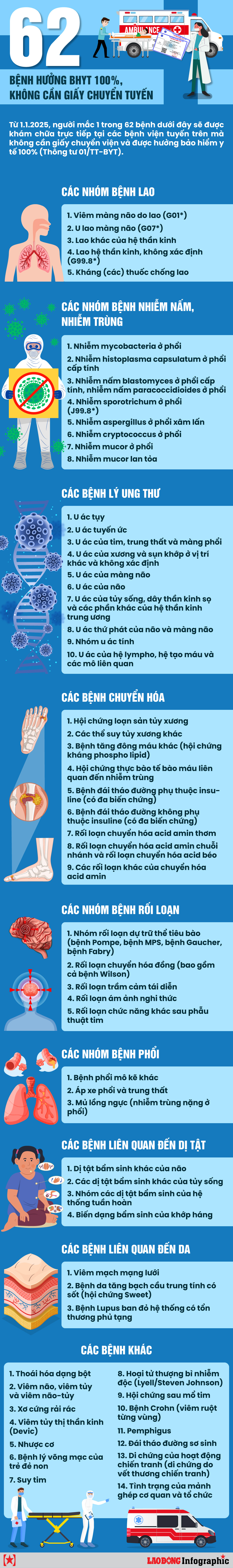 Danh mục 62 loại bệnh này bao gồm: nhóm bệnh nhiễm trùng, ung thư, rối loạn chuyển hóa, rối loạn dự trữ thể tiêu bào, bệnh lý thần kinh, tim mạch, phổi, da, dị tật bẩm sinh, kháng thuốc chống lao, di chứng chiến tranh và các trường hợp ghép tạng.