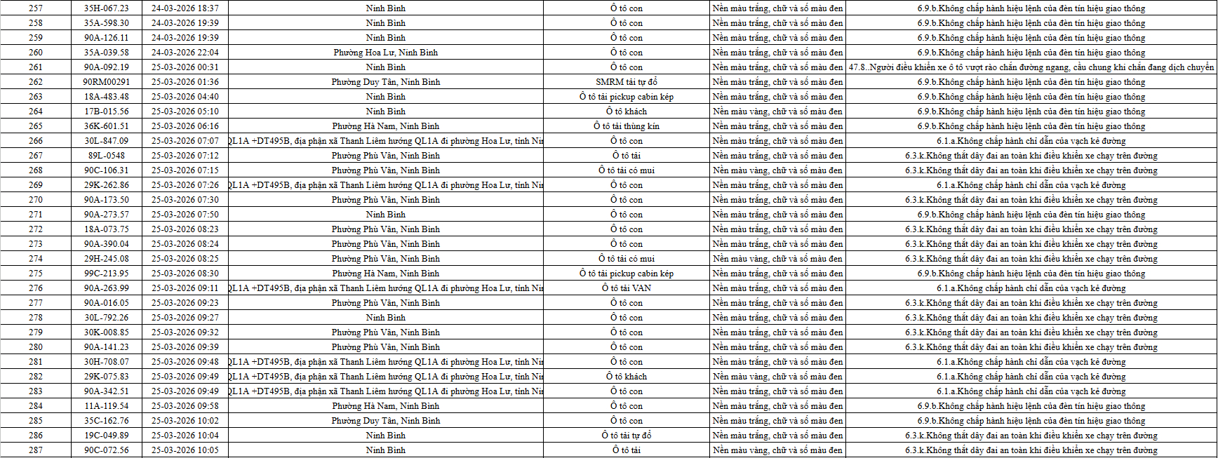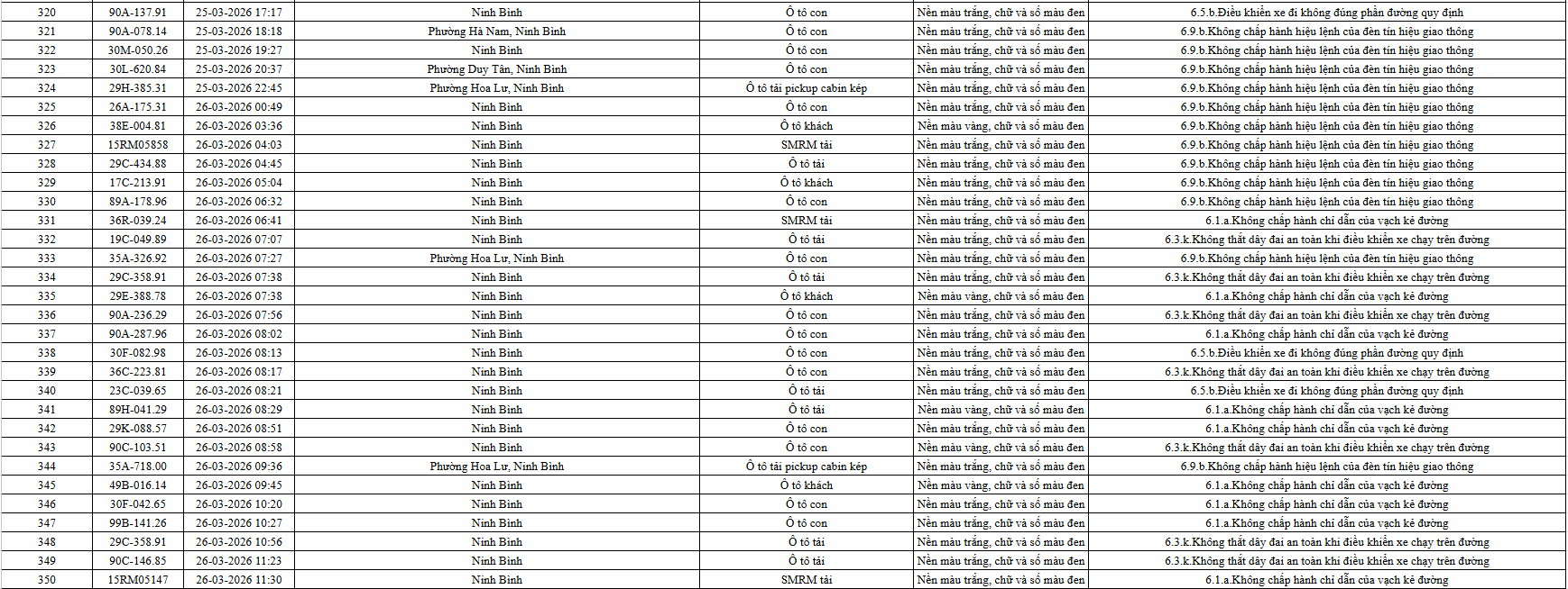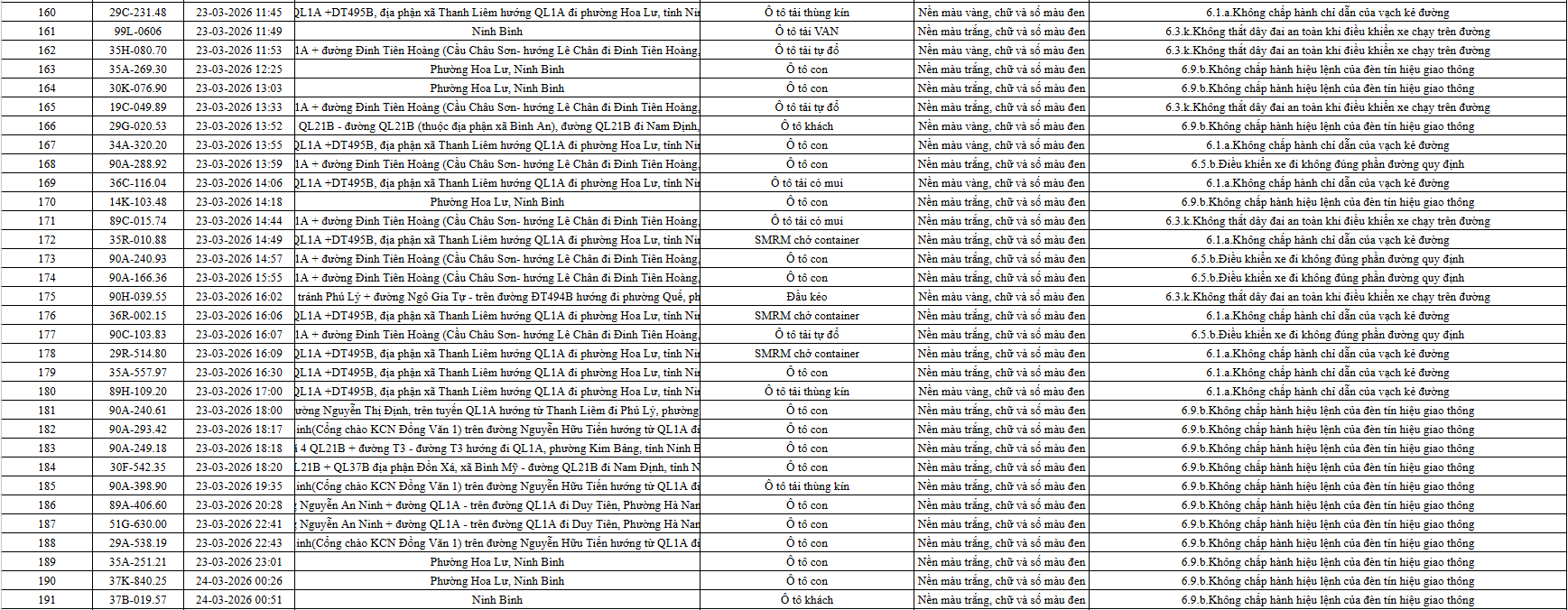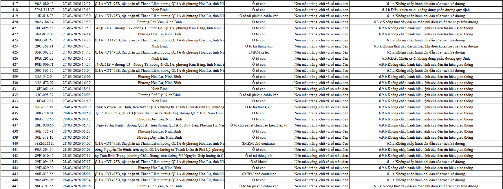 Theo thông báo của Phòng Cảnh sát giao thông Công an tỉnh Ninh Bình, từ ngày 21/3/2026 đến 31/3/2026 đã phát hiện 665 trường hợp phương tiện vi phạm trật tự an toàn giao thông qua hệ thống camera giám sát giao thông và phương tiện thiết bị kỹ thuật nghiệp vụ. Trong đó, phần lớn là lỗi không chấp hành hiệu lệnh của đèn tín hiệu giao thông. Danh sách cụ thể xem chi tiết tại đây: