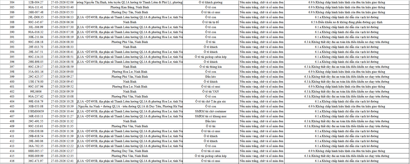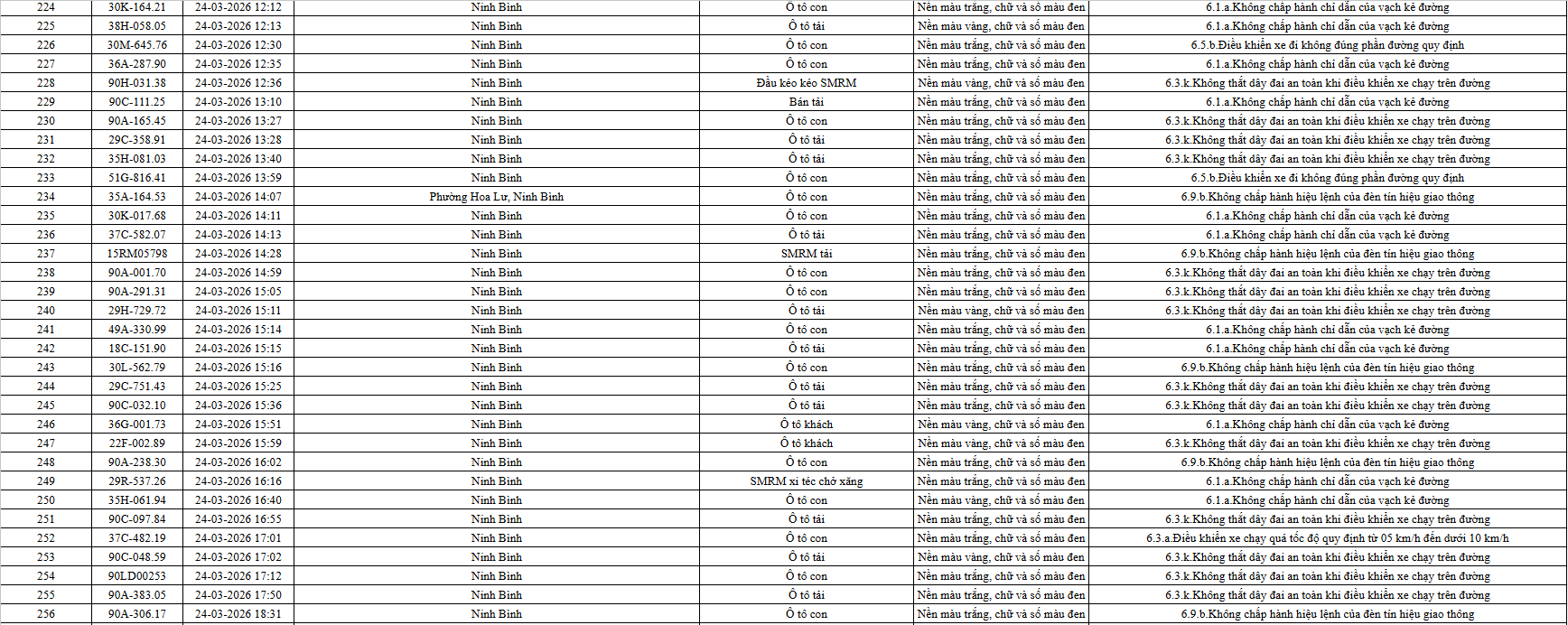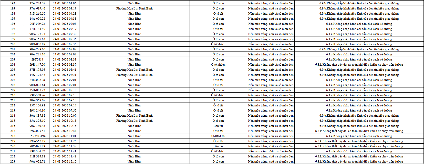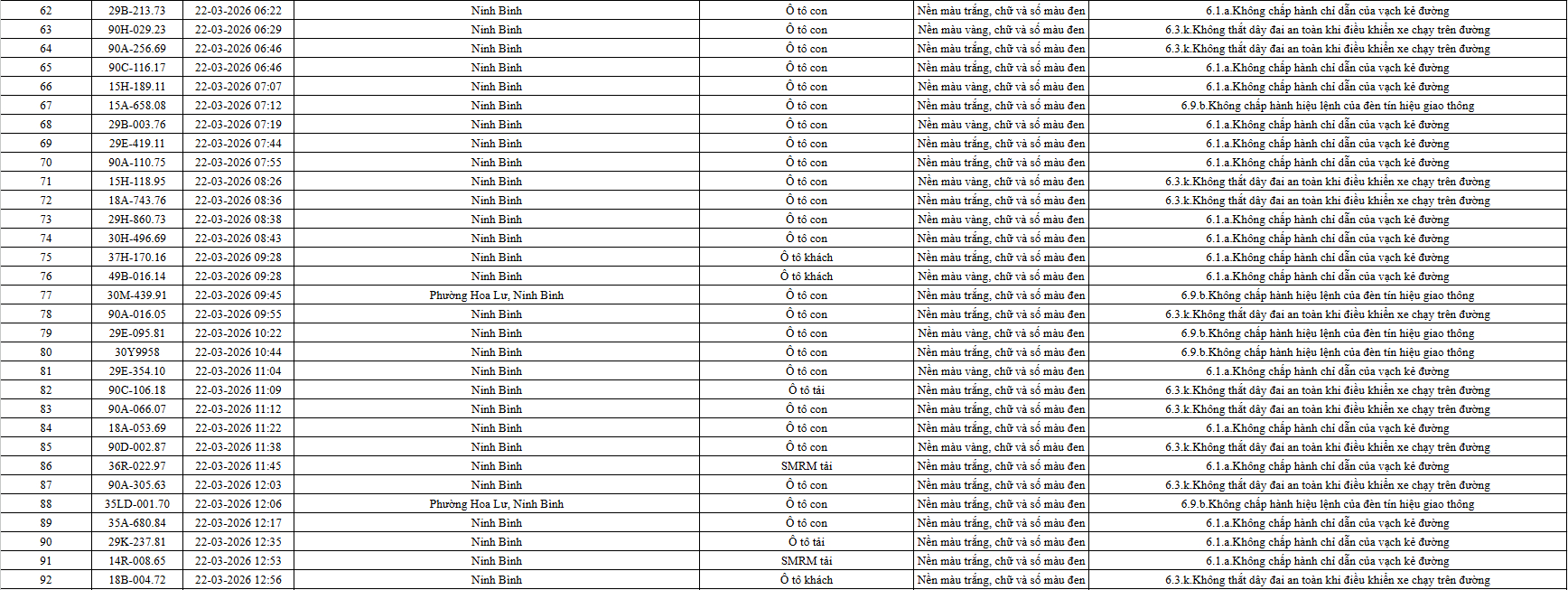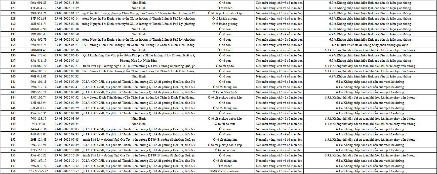 Theo thông báo của Phòng Cảnh sát giao thông Công an tỉnh Ninh Bình, từ ngày 21/3/2026 đến 31/3/2026 đã phát hiện 665 trường hợp phương tiện vi phạm trật tự an toàn giao thông qua hệ thống camera giám sát giao thông và phương tiện thiết bị kỹ thuật nghiệp vụ. Trong đó, phần lớn là lỗi không chấp hành hiệu lệnh của đèn tín hiệu giao thông. Danh sách cụ thể xem chi tiết tại đây: