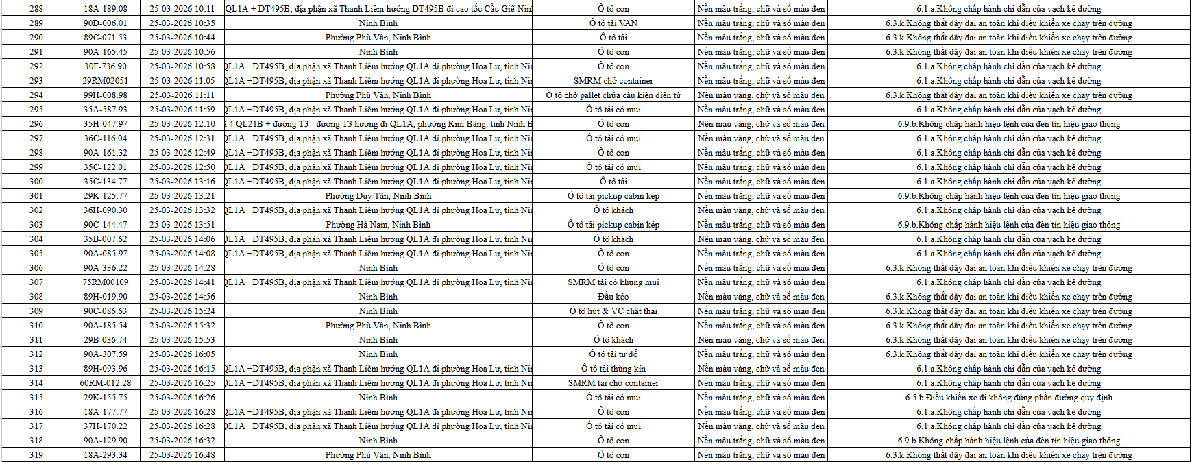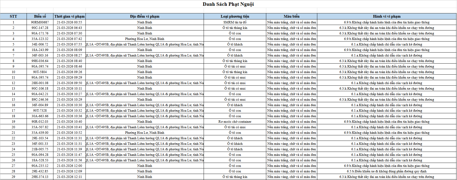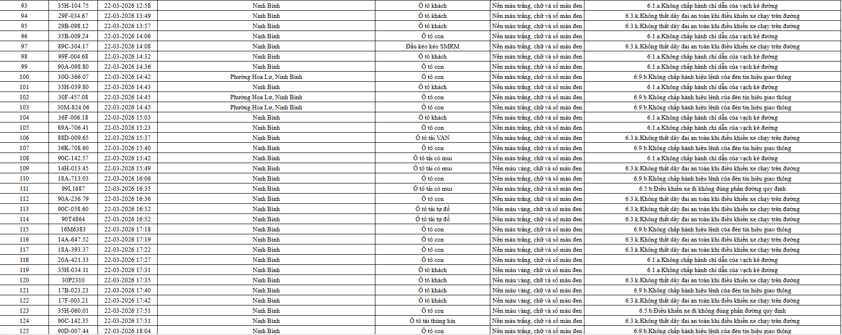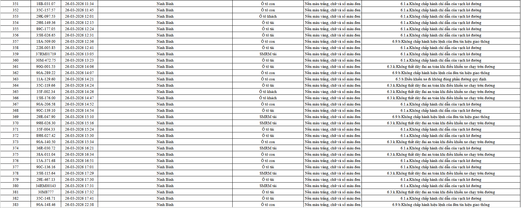 Theo thông báo của Phòng Cảnh sát giao thông Công an tỉnh Ninh Bình, từ ngày 21/3/2026 đến 31/3/2026 đã phát hiện 665 trường hợp phương tiện vi phạm trật tự an toàn giao thông qua hệ thống camera giám sát giao thông và phương tiện thiết bị kỹ thuật nghiệp vụ. Trong đó, phần lớn là lỗi không chấp hành hiệu lệnh của đèn tín hiệu giao thông. Danh sách cụ thể xem chi tiết tại đây: