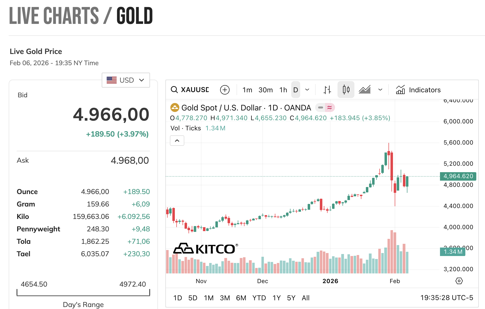 Trong thời gian gần đây, biên độ biến động hàng ngày của giá vàng đã mở rộng đến mức hiếm thấy, ngoài những thời điểm khủng hoảng. Điều này diễn ra sau một đợt tăng trưởng phi thường. Từ góc nhìn đó, sự điều chỉnh vừa qua không chỉ có thể dự đoán được mà còn cần thiết. Mặc dù thị trường đã giảm so với mức cao kỷ lục mọi thời đại của tuần trước, giá vàng dường như đang ổn định hơn khi giao dịch trong phạm vi từ 4.500 đến 5.000 đô la một ounce. Bất chấp sự biến động, giá vàng vẫn tăng được 1% trong tuần này.