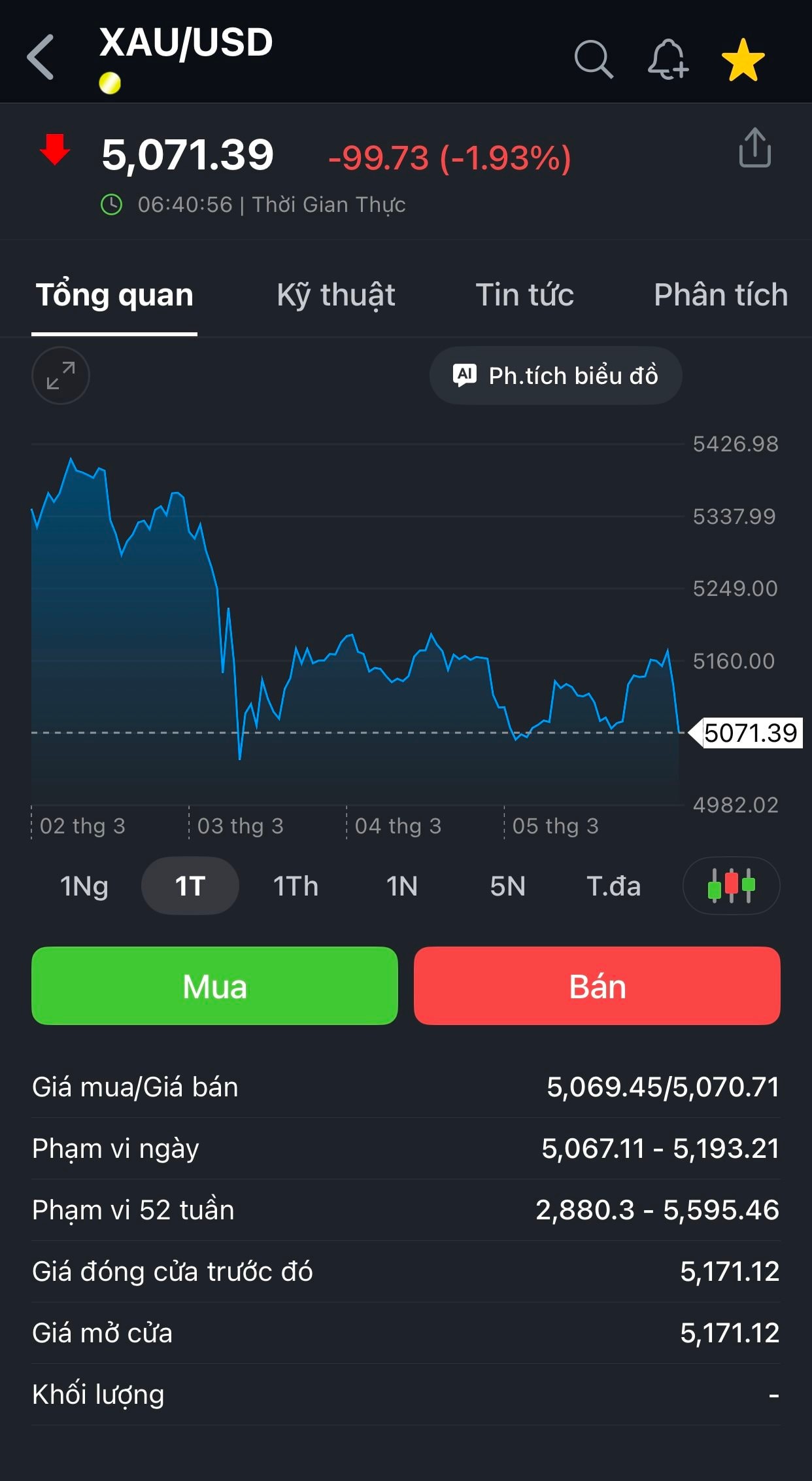 Ghi nhận trong sáng ngày 9/3/2026 thì giá vàng thế giới giao ngay đang giao dịch quanh ngưỡng 5.068 USD/ounce, thậm chí có thời điểm đã nhúng xuống sát mốc tâm lý quan trọng 5.000 USD/ounce trước khi hồi phục nhẹ.