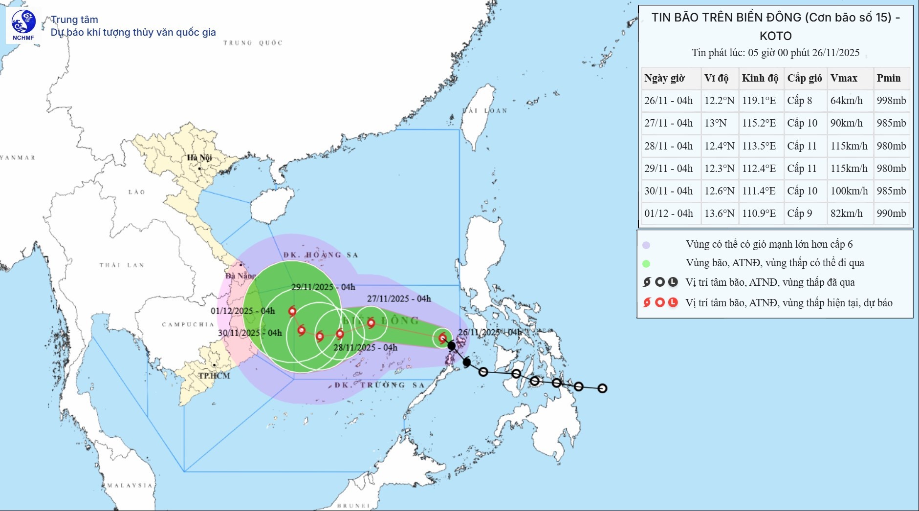 Báo Vietnamnet ngày 26/11/2025 đăng bài: "Bão Koto thành bão số 15 trên Biển Đông: Đường đi cực phức tạp, có thể mạnh thêm", dự báo tình hình cơn bão sắp tới như sau: