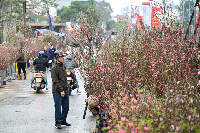 Người dân đi xem đào Tết dưới tiết trời mưa ẩm ngày 11/2. Ảnh: Giang Huy