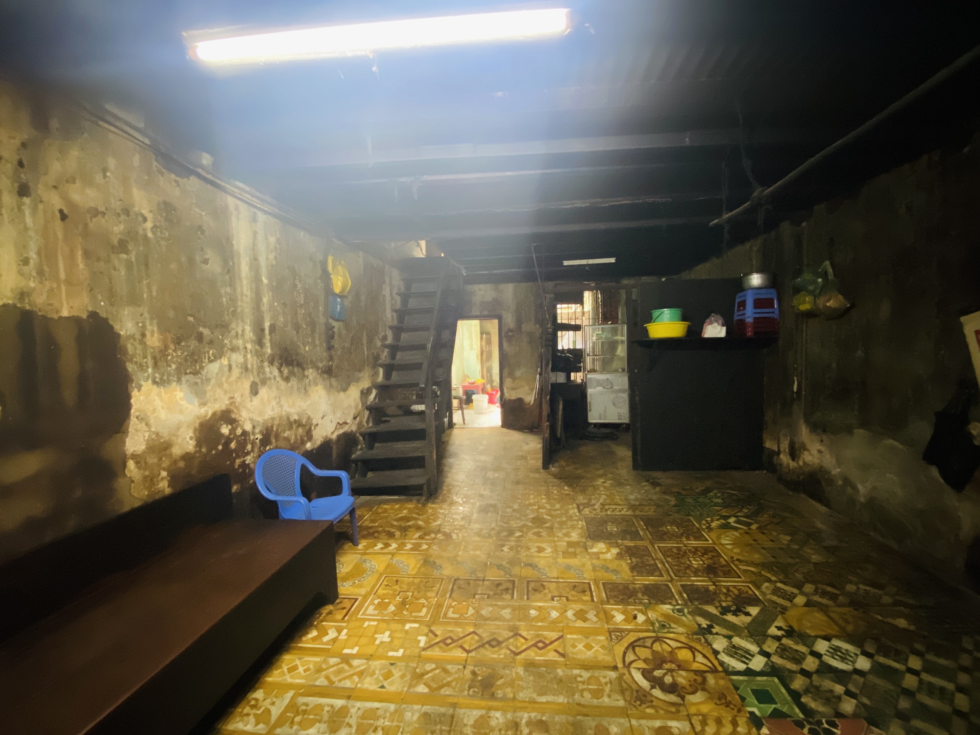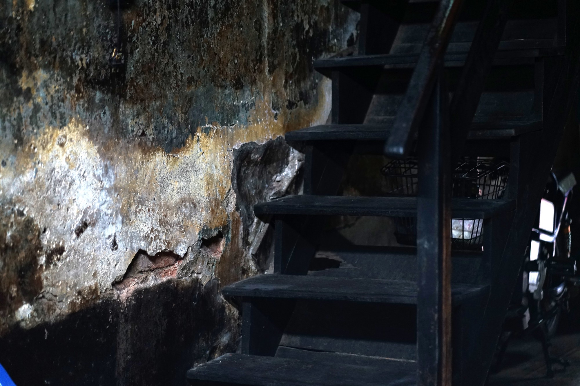 Trong căn nhà cổ mang phong cách Pháp và Trung Hoa, những bức tường thạch cao trắng lặng lẽ ố vàng, từng mảng vôi bong tróc nham nhở, rụng lả tả nếu có ai nhỡ động mạnh… Bước vào bên trong, không gian chật hẹp càng trở nên tối tăm, ẩm thấp với các bức tường và trần nhà lót gỗ ám khói bếp đen kịt.