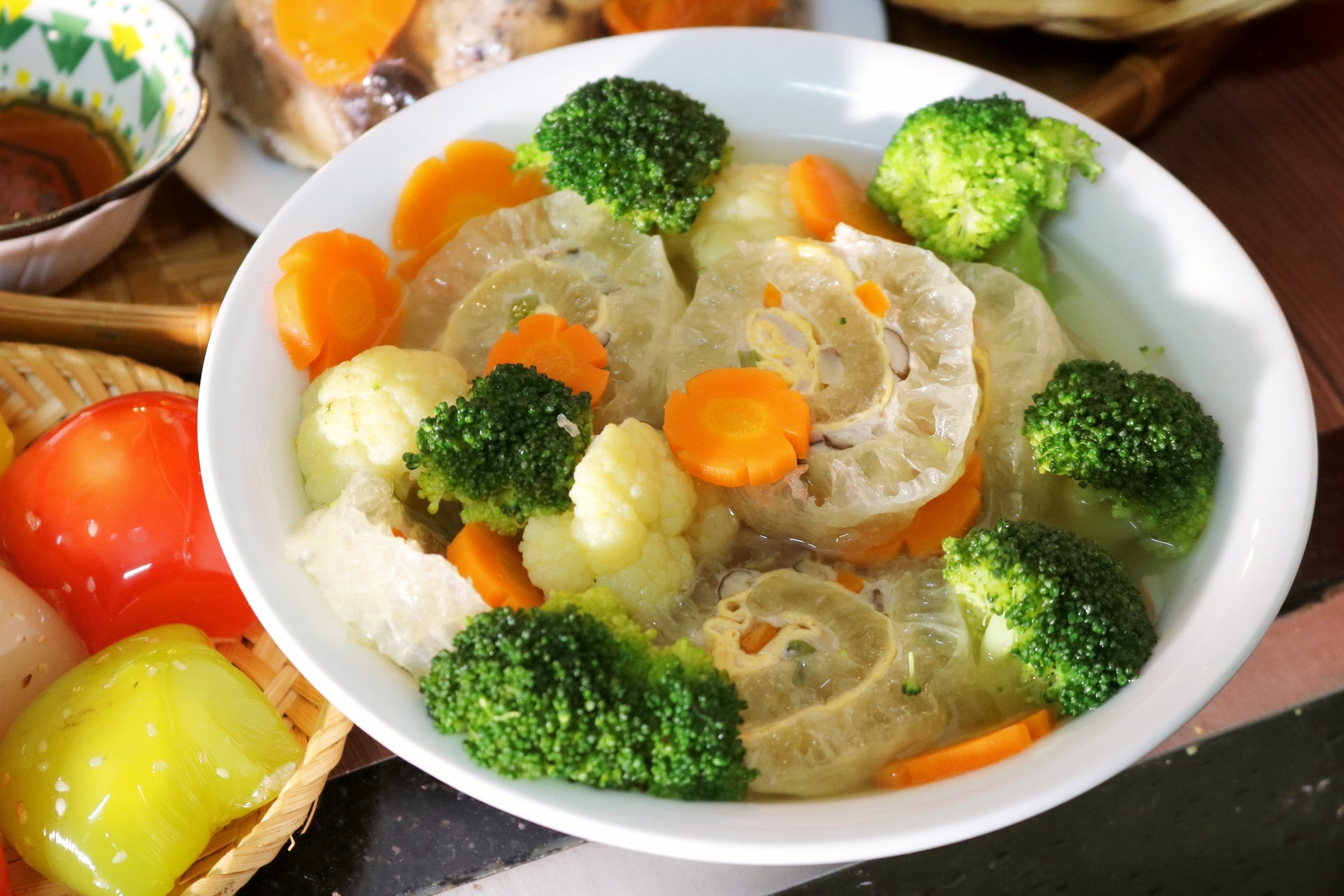 Các món ăn kèm cũng cần được chế biến tỉ mỉ. Một bát canh măng móng giò ninh kỹ, nước dùng trong veo, ngọt lừ; một đĩa giò lụa thái miếng đều tăm tắp; đĩa xào thập cẩm với màu xanh của đậu, màu đỏ của cà rốt, màu trắng của su hào tạo nên bức tranh ẩm thực rực rỡ sắc màu.