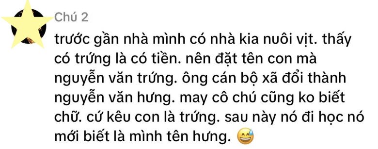 Theo đó người này kể, ở cạnh nhà mình có gia đình nuôi vịt kiếm sống, thấy có trứng là có tiền nên vợ chồng cô chú đó đã đặt tên cho con trai là Nguyễn Văn Trứng. Rất may mắn cán bộ xã đã đổi lại thành tên khác vừa hay lại vừa nam tính là Nguyễn Văn Hưng, mãi đến khi lớn lên đi học thì bé mới biết mình đã được đổi tên thành Hưng, vì ở nhà bố mẹ cứ gọi là trứng.