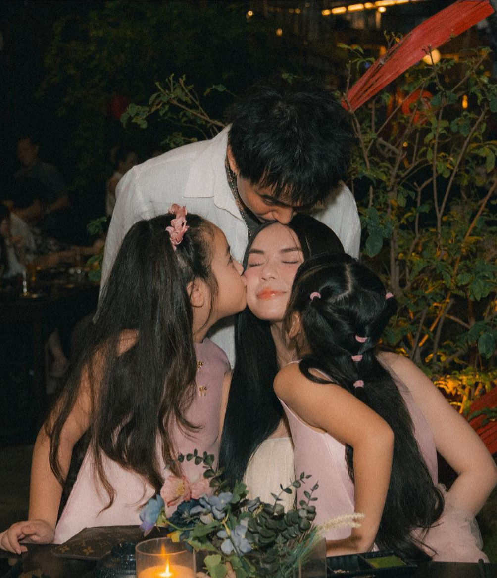 Cindy Lư tận hưởng khoảnh khắc chồng con âu yếm ôm hôn cô. Với người đẹp 9X ông xã và hai bé Gà Cún hiện là gia tài lớn nhất.