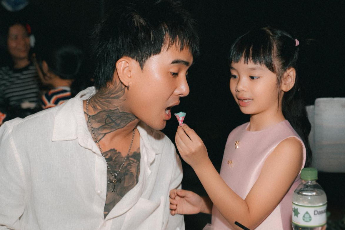 Bé Gà (thứ hai từ trái qua) năm nay 8 tuổi và em gái tên Cún 7 tuổi, là con của Cindy Lư và ca sĩ Hoài Lâm. Sau khi bố mẹ chia tay, các bé ở với Cindy Lư. Hồi tháng 7, vợ cũ Hoài Lâm kết hôn lần hai với ca sĩ Đạt G. Gà và Cún hiện được cha dượng yêu thương, xem như con ruột.