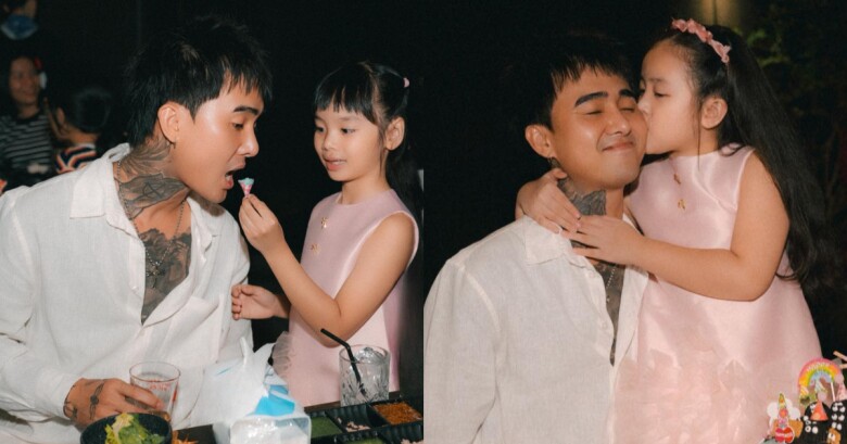 Trong hình ảnh được chia sẻ, vợ chồng Cindy Lư chuẩn bị buổi tiệc ấm cúng cho ái nữ. Bé Gà và Cún quấn quýt, bày tỏ sự yêu thương cho bố dượng. Khoảnh khắc 2 nhóc tì ôm hôn bố dượng khiến người xem "tan chảy".