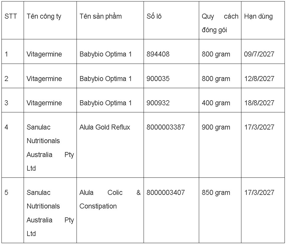 Danh sách thu hồi gồm nhóm sữa công thức Babybio Optima 1 của nhà sản xuất Vitagermine và thực phẩm công thức Alula Colic & Constipation của Sanulac Nutritionals Australia Pty Ltd. Qua rà soát hậu kiểm, Cục An toàn thực phẩm phát hiện các mặt hàng này đang được rao bán tràn lan trên nhiều nền tảng trực tuyến lớn như Shopee, Lazada và Ausmart.