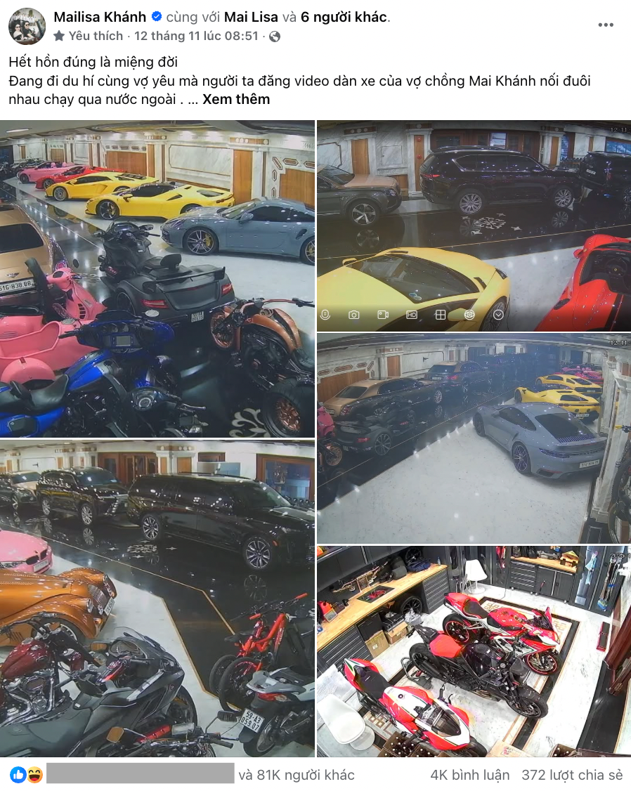 "Hết hồn đúng là miệng đời. Đang đi du hí cùng vợ yêu mà người ta đăng video dàn xe của vợ chồng Mai Khánh nối đuôi nhau chạy qua nước ngoài. Giật mình mở camera gara xe thấy các em yêu của anh vẫn nằm ngay hàng thẳng lối" - Hoàng Kim Khánh nói.