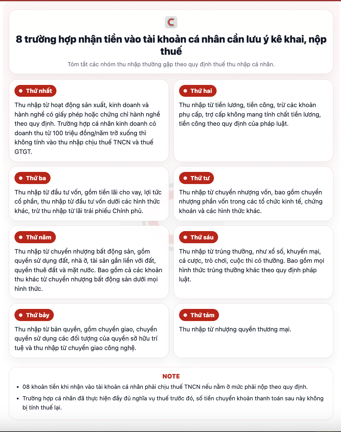 Mặt khác, Chi cục Thuế Thương mại điện tử – Cục Thuế đã có thông tin về 8 trường hợp nhận tiền vào tài khoản cá nhân thuộc diện thu nhập chịu thuế thu nhập cá nhân (TNCN), căn cứ theo Điều 3 Luật Thuế TNCN năm 2007, được sửa đổi, bổ sung năm 2012 và năm 2014. Cụ thể, 8 trường hợp gồm: