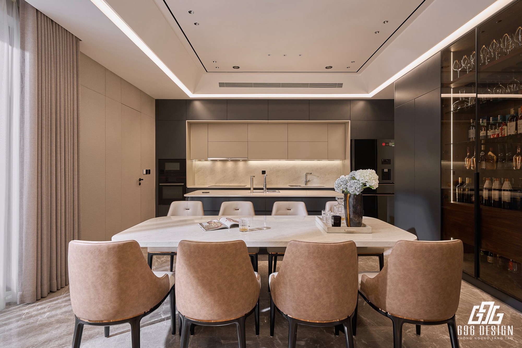 Ở khu vực bếp, mọi chi tiết đều thể hiện sự chỉn chu: hệ thống tủ bếp âm tường tone be - xám, thiết bị nấu nướng nhập khẩu châu Âu, mặt bếp phủ đá vân mây sang trọng. Đặc biệt, hệ thống đèn âm trần và đèn hắt tường được lắp đặt khéo léo, vừa đảm bảo ánh sáng, vừa tạo hiệu ứng thị giác ấm áp.