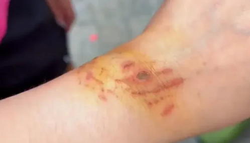 Trước khi được điều trị, trên cổ tay trái của cô có một lỗ hổng to bằng hạt đậu xanh vẫn đang chảy máu, và có những vết trầy xước gần đó.