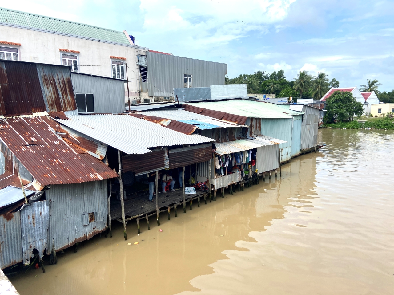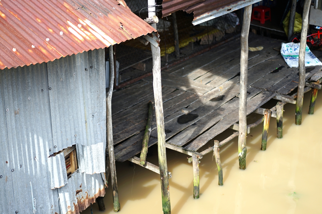 Được biết, căn nhà chị Lê Thị Kiều nằm lọt thỏm dưới gầm cầu Thứ Ba chợ (cũ), chênh vênh trên những cây cọc gỗ cắm tạm bên mé sông.
