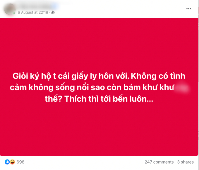 Thế nhưng mới đây, trên trang Facebook của anh Hoa Cương bất ngờ đăng tải một dòng trạng thái rất gay gắt cho thấy cặp đôi đang gặp trục trặc trong hôn nhân. "Giỏi ký hộ tôi cái giấy ly hôn với. Không có tình cảm không sống nổi sao còn bám khư khư thế? Thích thì tới bến luôn...", Hoa Cương chia sẻ.