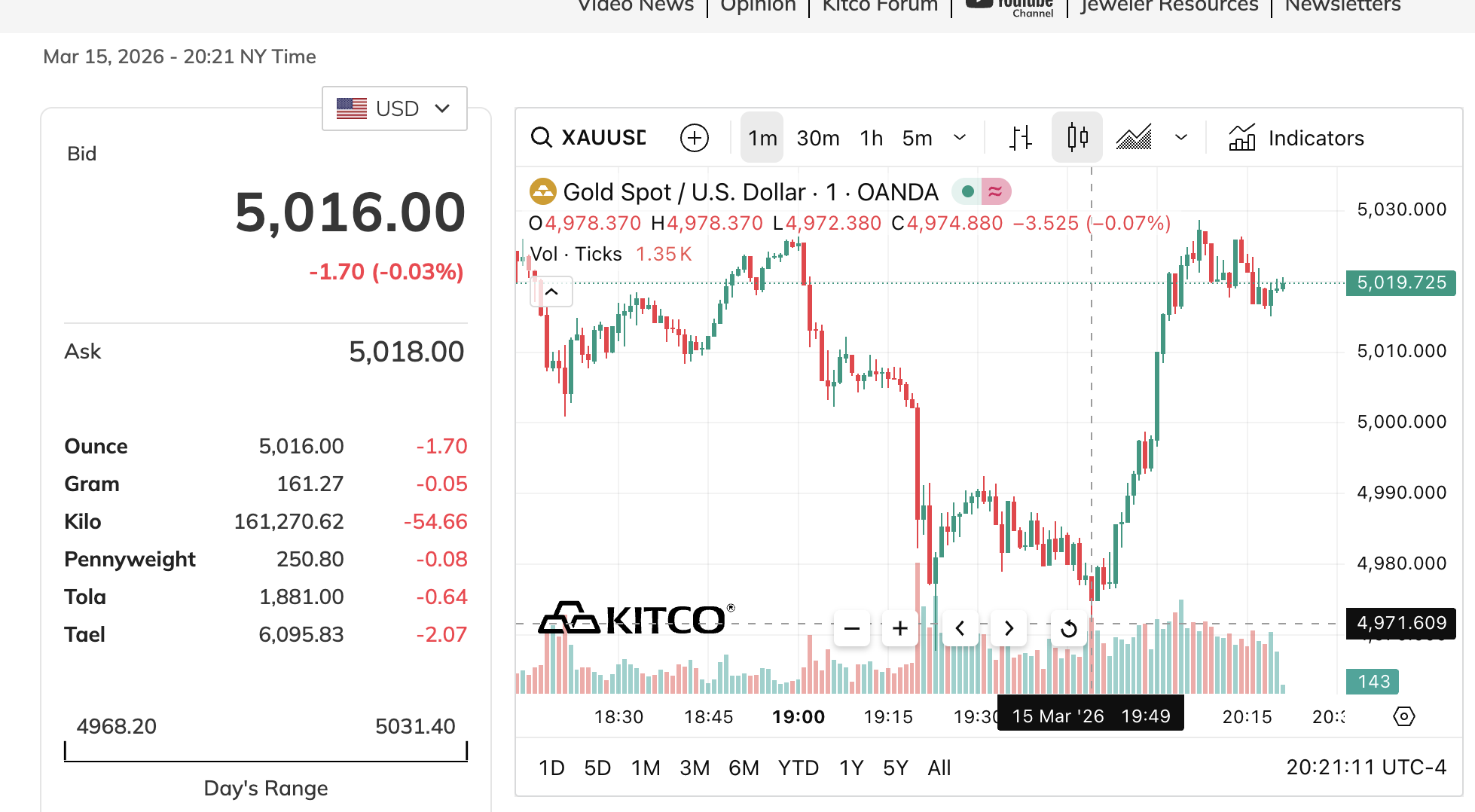 Lúc 7 giờ 30 ngày 16-3, theo giờ Việt Nam, giá vàng thế giới được giao dịch ở mức 5.018 USD/ounce, giảm nhẹ so với phiên trước. Trước đó, chỉ ít phút sau khi mở cửa tuần giao dịch mới, giá vàng hôm nay biến động rất mạnh.