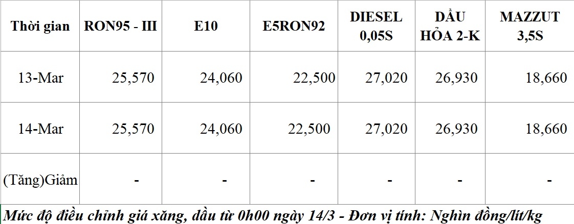 Tại kỳ điều hành tối 13/3, giá xăng RON95-III là 25.570 đồng/lít; Giá xăng E10 là 24.060 đồng/lít; giá xăng E5RON92 là 22.500 đồng/lít; Giá dầu diesel 0.05S là 27.020 đồng/lít; Giá dầu hỏa là 26.930 đồng/lít; Giá dầu mazut 180CST 3.5S kỳ này là 18.660 đồng/kg.