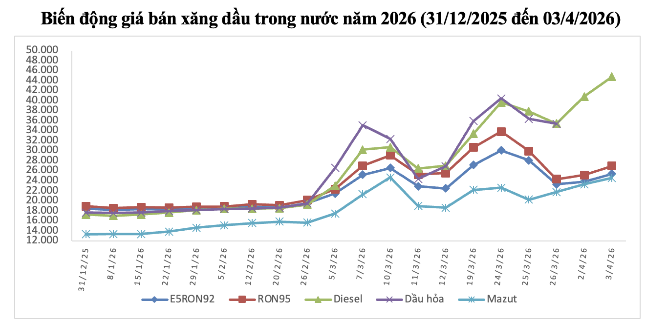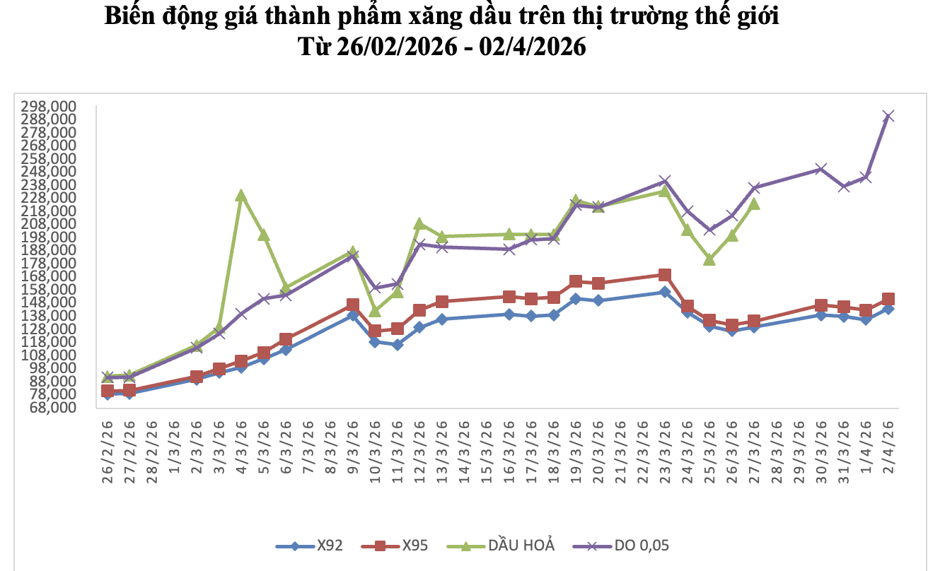 Giá thành phẩm xăng dầu thế giới bình quân giữa kỳ điều hành giá ngày 03/4/2026 và kỳ điều hành ngày 02/4/2026 là: 144,500 USD/thùng xăng RON92 dùng để pha chế xăng E5RON92 (tăng 10,066 USD/thùng, tương đương tăng 7,49%); 151,740 USD/thùng xăng RON95 (tăng 11,102 USD/thùng, tương đương tăng 7,89%); 291,820 USD/thùng dầu diesel 0,05S (tăng 54,538 USD/thùng, tương đương tăng 22,98%); 742,030 USD/tấn dầu mazut 180CST 3,5S (tăng 44,198 USD/tấn, tương đương tăng 6,33%).