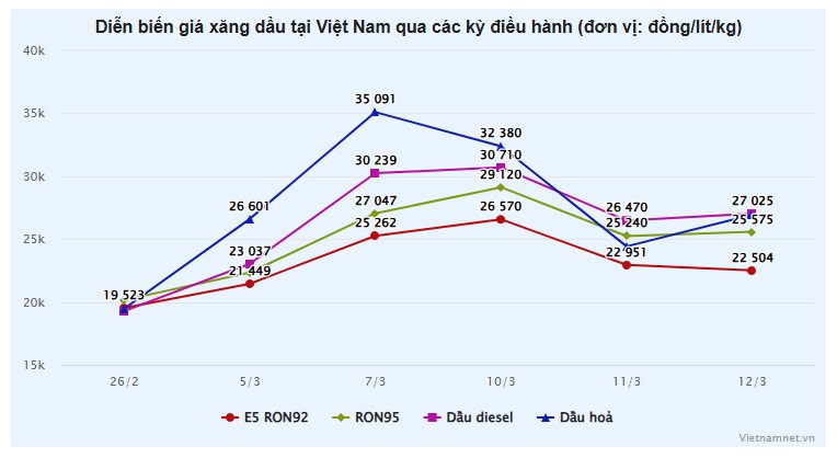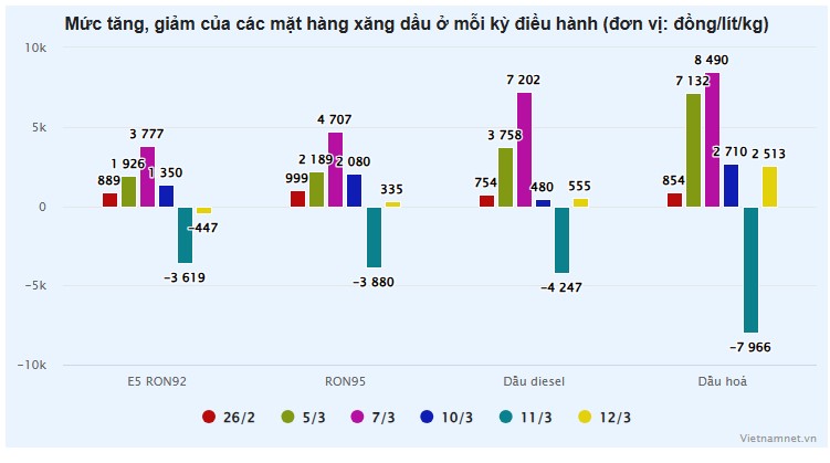 Dù vậy, ở kỳ điều chỉnh ngày 12/3, giá xăng E5 RON92 vẫn tăng 2.981 đồng/lít (+15,27%) so với ngày 26/2, xăng RON95 tăng 5.424 đồng/lít (+26.91%), dầu diesel tăng 7.746 đồng/lít (+40,18%), dầu hoả tăng 7.463 đồng/lít (+38,33%) và dầu mazut tăng 2.972 đồng/kg (+18,94%).