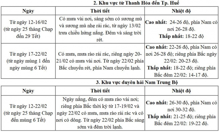 Phía Bắc khu vực từ Thanh Hoá đến Huế mưa vài nơi; phía Nam có mưa, mưa vừa, có nơi mưa to trong ngày 9/2, sau có mưa, mưa rào rải rác, từ 10/2, mưa vài nơi. Trời rét.