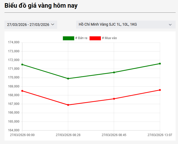 Cập nhật đầu giờ chiều ngày 27/3, công ty SJC bất ngờ điều chỉnh tăng giá vàng miếng lên 168,6 - 171,6 triệu đồng/lượng, tăng 1 triệu so với sáng nay. Giá vàng nhẫn trơn cũng được điều chỉnh lên 168,4 - 171,4 triệu đồng/lượng.