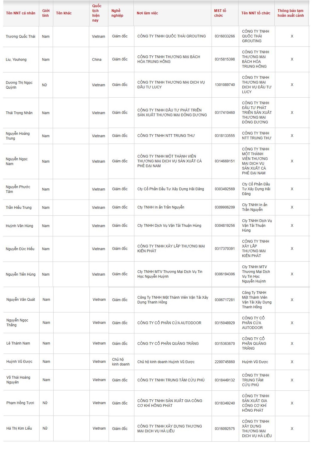 Danh sách người nộp thuế bị thông báo tạm hoãn xuất cảnh gồm: