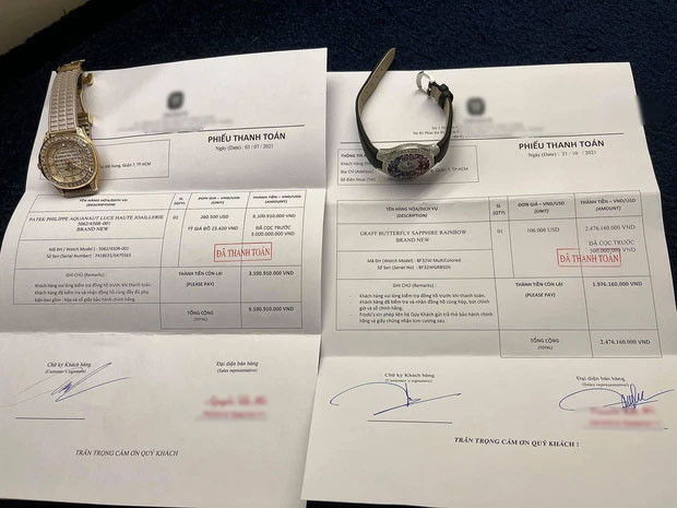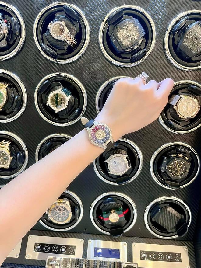 Một lần mua sắm cùng ông xã hồi tháng 10/2020, cô tậu siêu phẩm Richard Mille RM 07-01 giá 195.000 USD (4,5 tỷ đồng), còn doanh nhân Quốc Vũ chọn chiếc Rolex hơn một tỷ đồng.