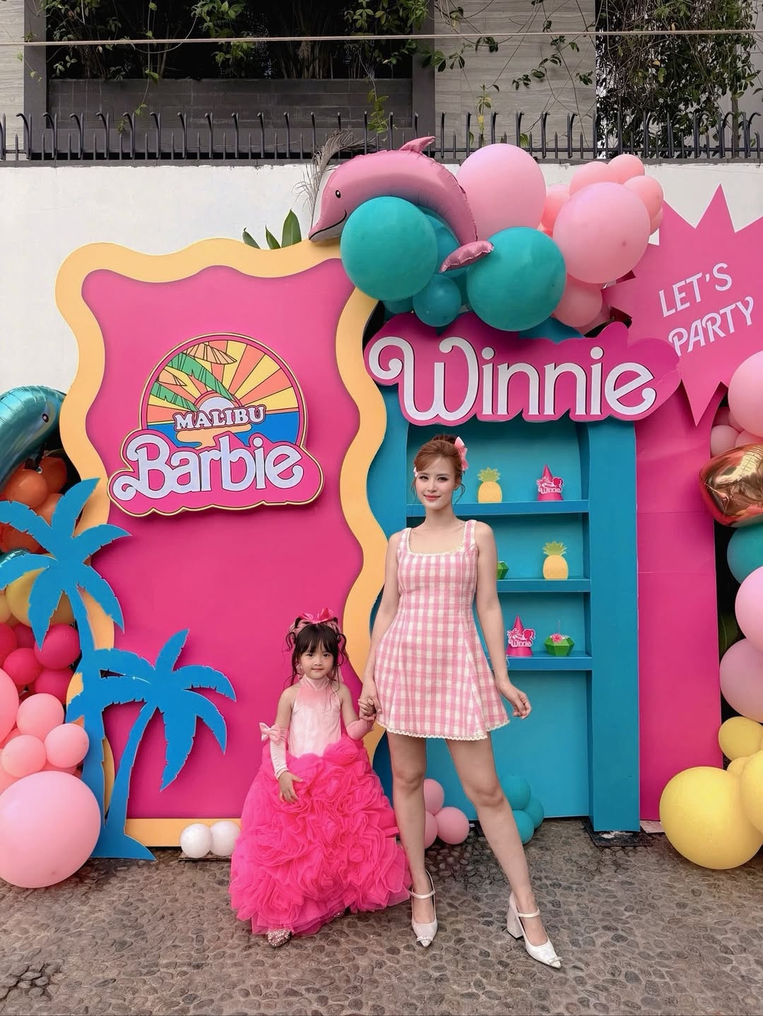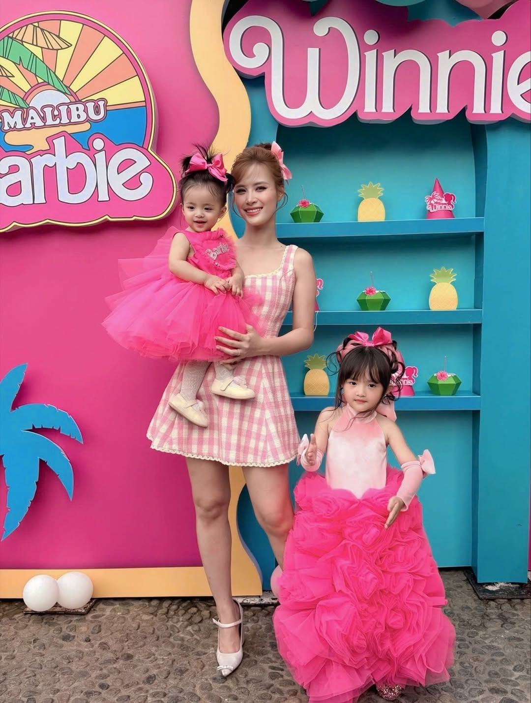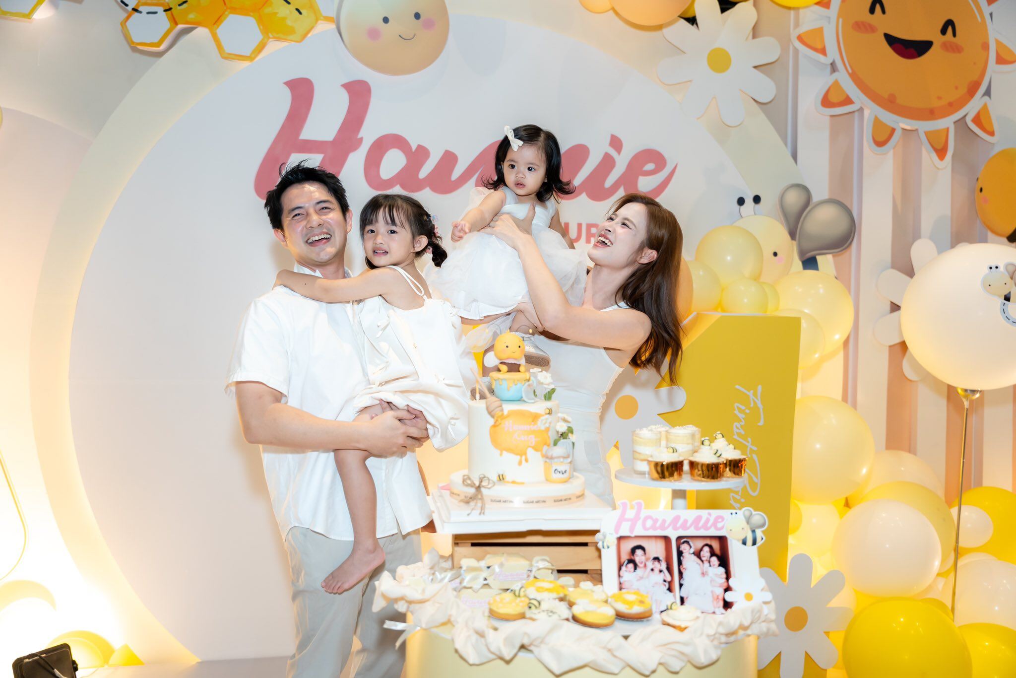 Chủ nhân buổi tiệc sinh nhật - bé Winnie diện váy công chúa bồng xòe, tóc thắt nơ khoe visual vô cùng xinh xắn và đáng yêu. Ái nữ Hannie cũng chẳng kém cạnh chị khi được mẹ diện váy điệu đà.