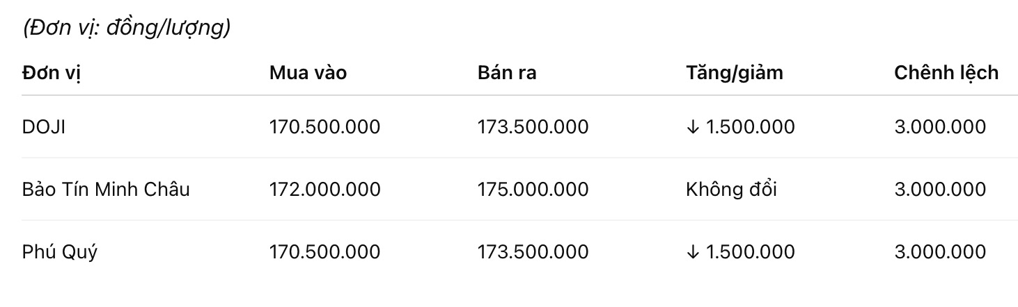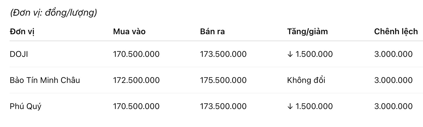 Tập đoàn Vàng Bạc Đá Quý Phú Quý niêm yết giá vàng miếng SJC ở ngưỡng 170,5-173,5 triệu đồng/lượng (mua vào - bán ra), giảm 1,5 triệu đồng/lượng cả hai chiều mua vào và bán ra. Chênh lệch giá mua vào - bán ra ở ngưỡng 3 triệu đồng/lượng.