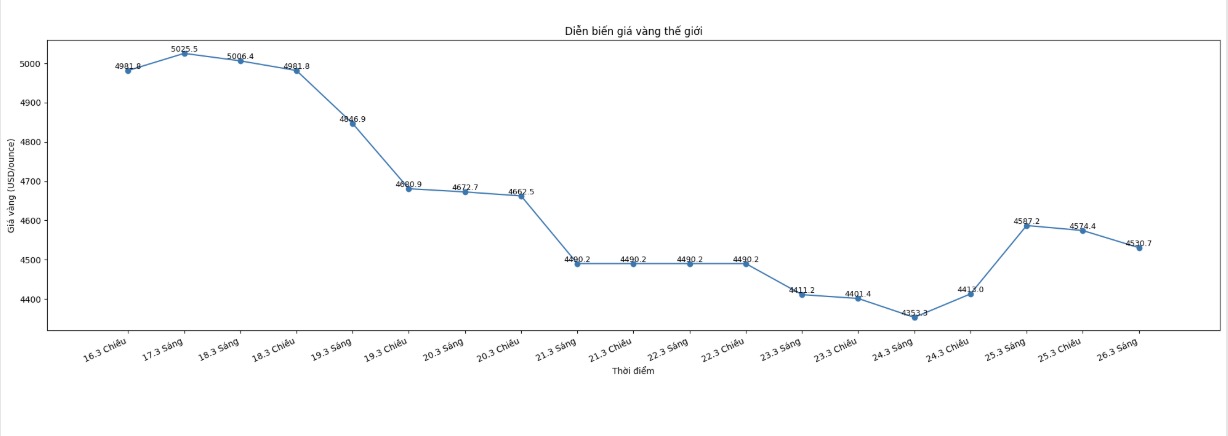 Lúc 9h13, giá vàng thế giới niêm yết quanh ngưỡng 4.530,7 USD/ounce, giảm 56,5 USD so với một ngày trước.