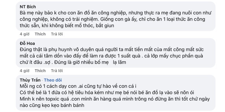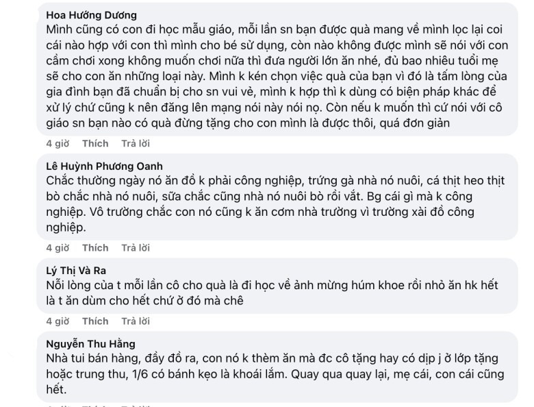 Bên dưới bài chia sẻ của người mẹ, rất nhiều phụ huynh để lại bình luận trái chiều. Một số người dành lời khen cho người mẹ, vì chăm con, nuôi con kỹ tính và cẩn thận. Tuy nhiên, một bộ phận phụ huynh khác, cộng đồng mạng lại tỏ ra khó chịu, phê bình và thậm chí chỉ trích người mẹ, cho rằng chị đăng tải câu chuyện như vậy không khéo chút nào.