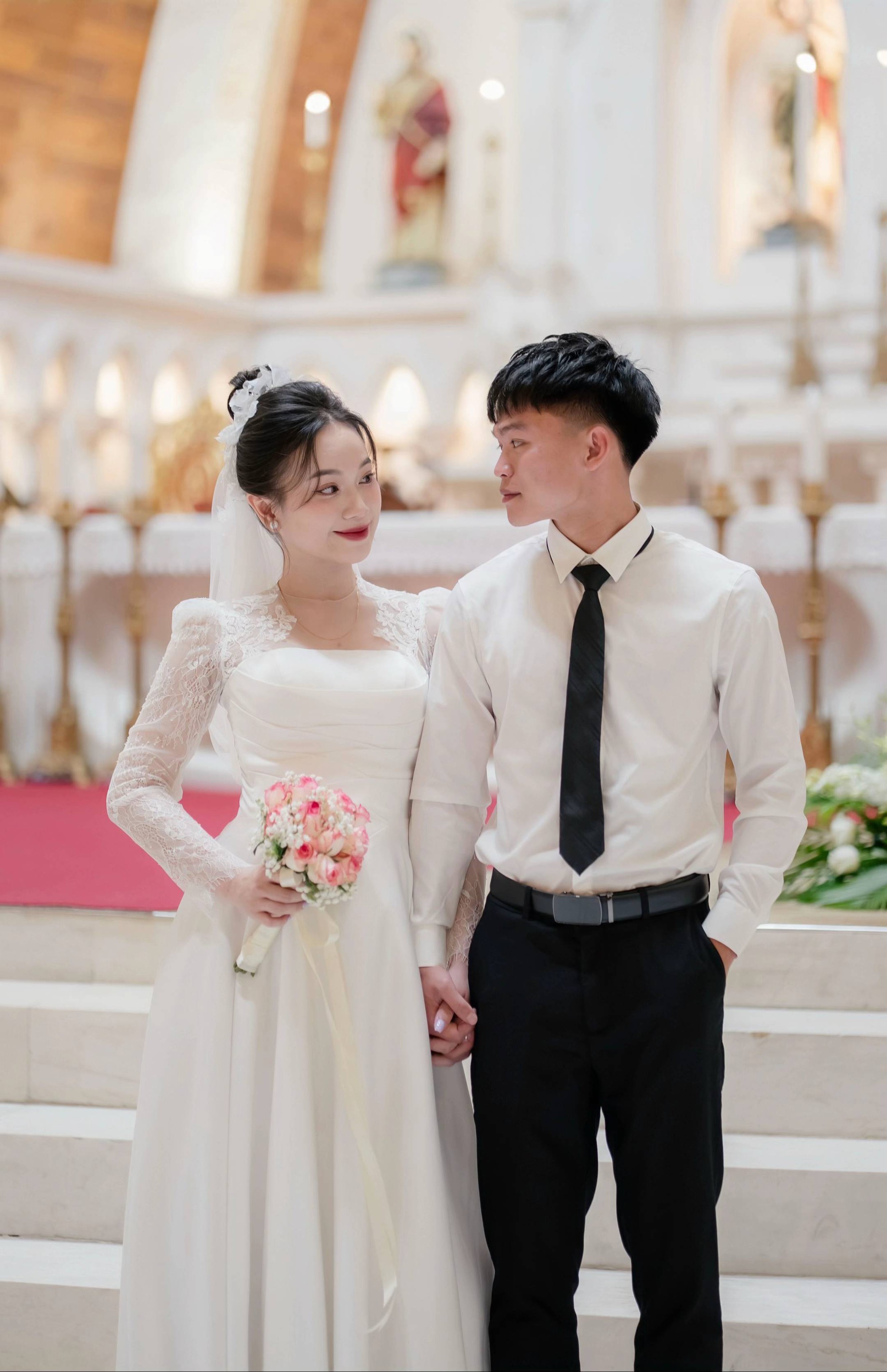 Lễ cưới tại nhà thờ chỉ có sự tham dự của những người thân thiết nên cặp đôi cũng chọn trang phục không quá cầu kỳ, đơn giản nhưng vẫn nổi bật. Cô dâu búi tóc gọn gàng và mặc chiếc váy dáng nhỏ gọn khoe trọn vóc dáng nuột nà. Cặp đôi nắm tay nhau đầy hạnh phúc để lữu giữ lại những kỷ niệm đẹp trong ngày trọng đại.
