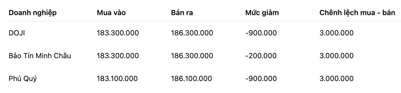 Tính đến 6h00, giá vàng miếng SJC được Tập đoàn DOJI niêm yết ở ngưỡng 183,3-186,3 triệu đồng/lượng (mua vào - bán ra), giảm 900.000 đồng/lượng cả hai chiều mua vào và bán ra. Chênh lệch giá mua vào - bán ra ở ngưỡng 3 triệu đồng/lượng.