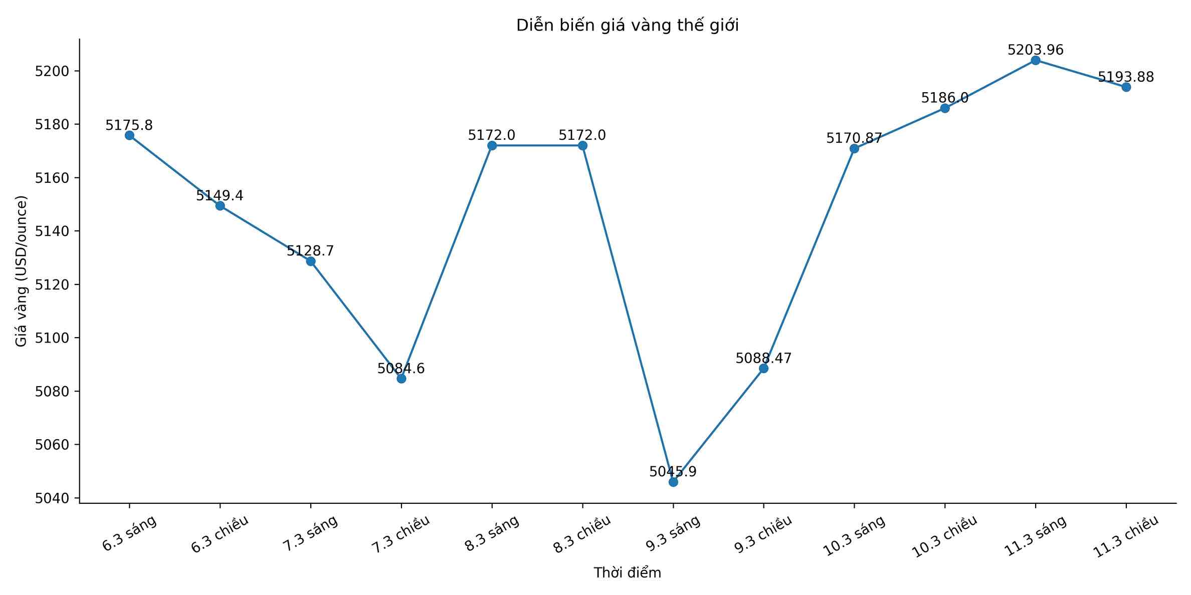 Diễn biến giá vàng thế giới những phiên giao dịch gần đây. Biểu đồ: Song Anh