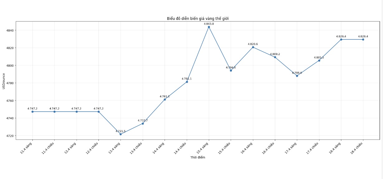 Dù nhiều lần kiểm định vùng 4.850 USD/ounce, giá vàng không thể vượt mốc 4.900 USD. Áp lực chốt lời cuối phiên khiến giá đóng cửa tuần ở mức 4.829 USD/ounce.