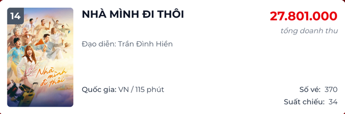 Sau gần ba tuần ra rạp kể từ mùng 10 Tết Ất Tỵ (26/2/2026), Nhà Mình Đi Thôi hiện mới thu về hơn 14 tỷ đồng. So với kỳ vọng dành cho một dự án ra mắt vào mùa phim đầu năm và quy tụ nhiều gương mặt quen thuộc, con số này được xem là khá khiêm tốn. Việc tụt xuống vị trí thứ 14 trên bảng xếp hạng doanh thu hằng ngày cho thấy bộ phim đang dần hụt hơi trong cuộc cạnh tranh tại rạp.