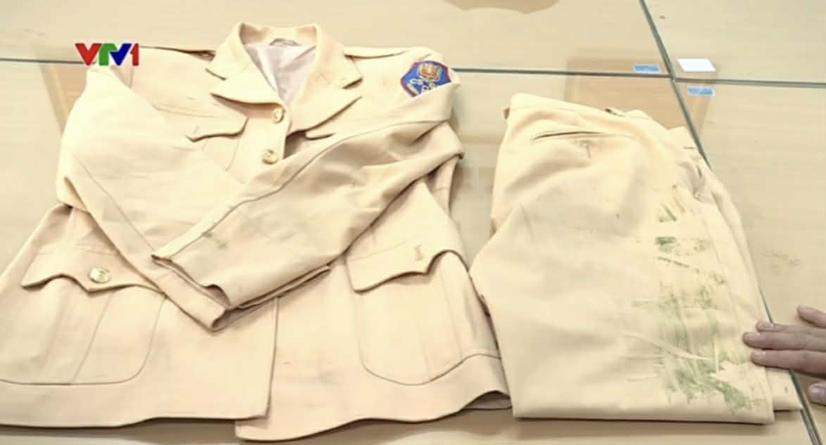 Vết bẩn do ngã xuống đường còn in trên bộ trang phục của đại úy Điệp. (Ảnh: VTV)