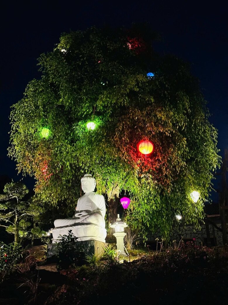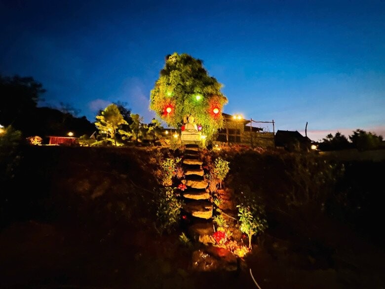 Bức tượng hiện được đặt trang trọng dưới gốc cây bồ đề lớn trong khuôn viên, xung quanh được trang trí bằng những chiếc đèn lồng rực rỡ, tạo nên không gian tâm linh huyền ảo và bình yên khi đêm xuống.