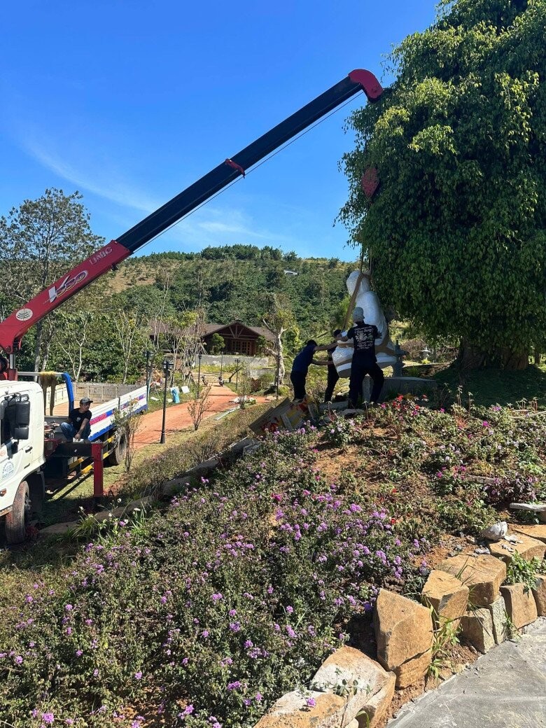 Vì bức tượng có kích thước và trọng lượng rất lớn, Việt Hương đã phải điều động xe cẩu chuyên dụng để vận chuyển vượt đường đèo lên tận đỉnh đồi nơi đặt biệt thự.