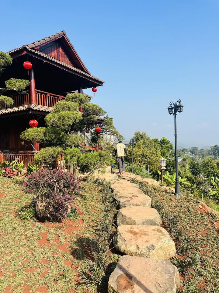 Những bậc thang bằng đá thô mộc dẫn lối lên nhà, xen kẽ là các loại hoa rực rỡ. Hệ thống đèn sân vườn được bố trí tinh tế, khiến toàn bộ cơ ngơi lung linh như một resort 5 sao vào buổi tối.