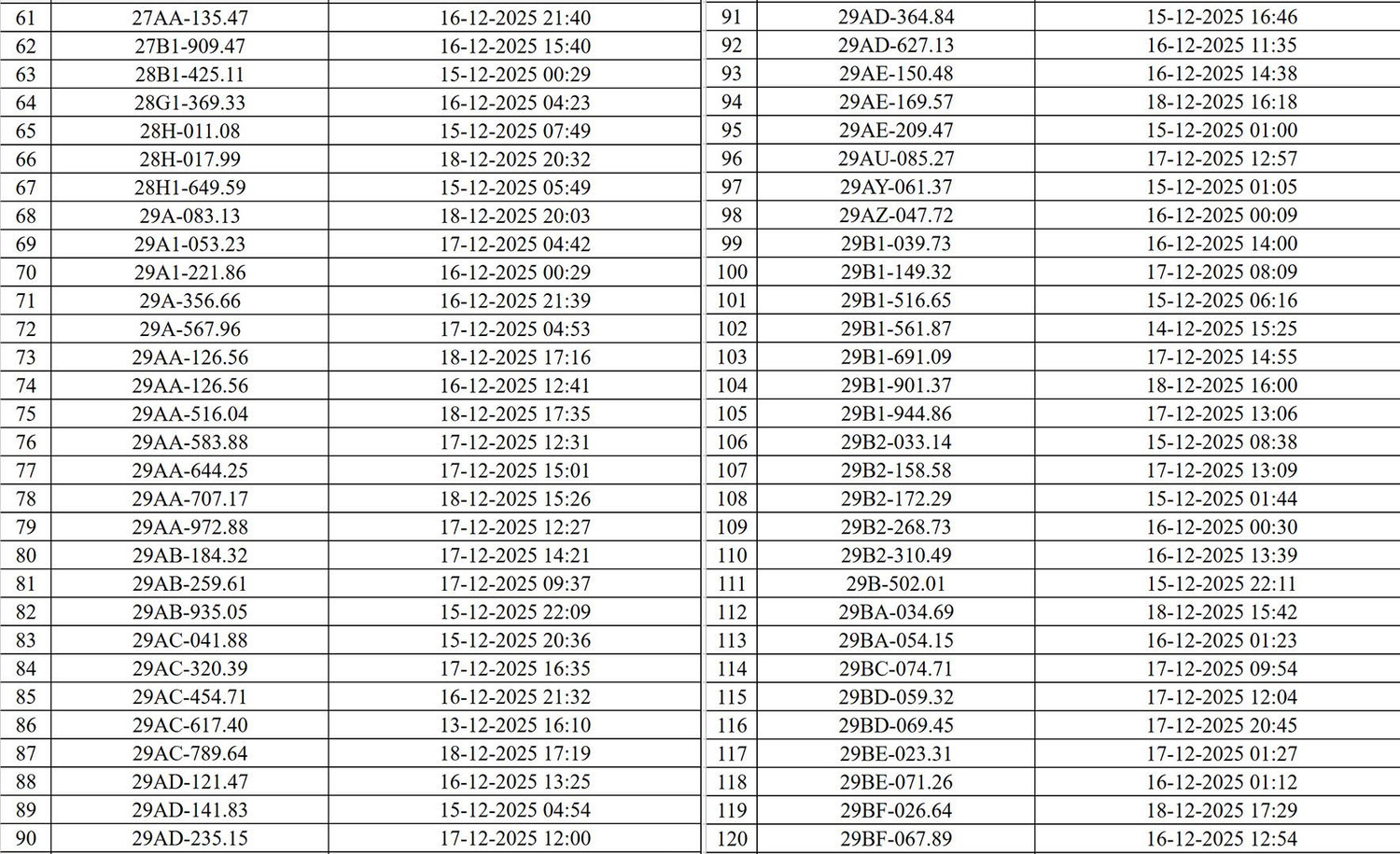 Phòng Cảnh sát giao thông (CSGT) - Công an TP Hà Nội công bố danh sách phương tiện vi phạm hành chính về trật tự, an toàn giao thông đường bộ từ ngày 13.12 - 18.12.2025. Hình ảnh vi phạm được ghi nhận qua camera AI do Phòng CSGT Hà Nội vận hành.