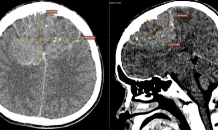 Hình ảnh được gửi hội chẩn với trung tâm chẩn đoán hình ảnh, hệ thống y tế Medlatec. Tại đây, các bác sĩ nhận định nhiều khả năng là u màng não có dấu hiệu chuyển dạng ác tính, xâm lấn xương trán và nhu mô não trán - đỉnh phải.
